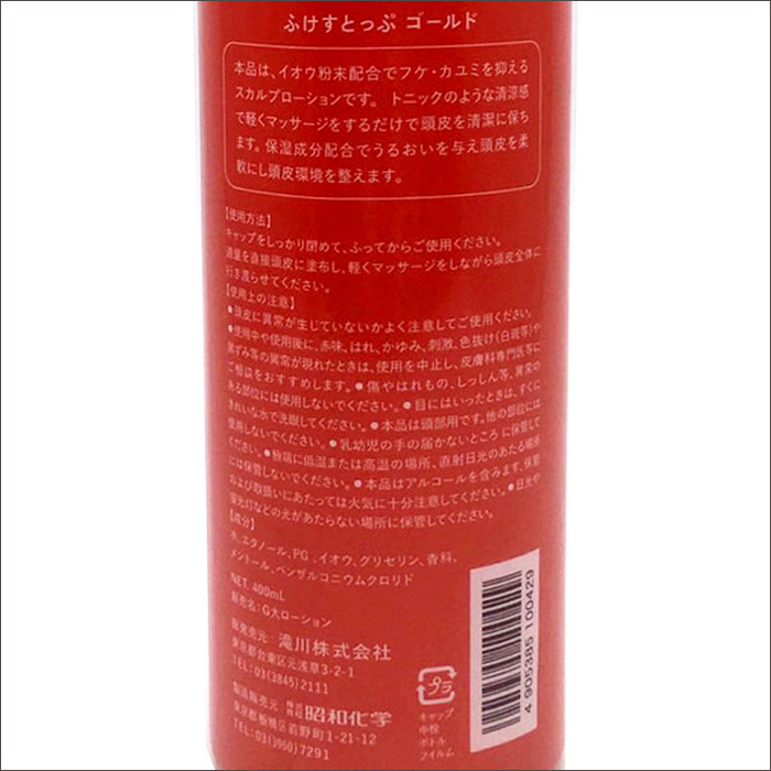 ★ふけストップ ゴールドローション(ショッピングの商品ページへ移動します) 小(130ml)単品 小(130ml)単品送料別 大(400ml)単品 大(400ml)単品送料別 大(400ml)2本セット 【2個セット】ふけストップ ゴールド ローション(大)400ml フケストップゴールド G大ローション ふけすとっぷ 滝川 昭和化学 タキガワ サロン専売品 スカルプローション トニック 頭皮 マッサージ ![]() ![]()
