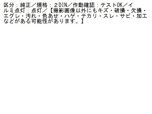 | 商品情報 | 区分:純正/規格:2DIN/作動確認:テストOK/イルミ点灯:点灯/【撮影画像以外にもキズ・破損・欠損・エグレ・汚れ・色あせ・ハゲ・テカリ・スレ・サビ・加工などがある可能性があります。】 | ||