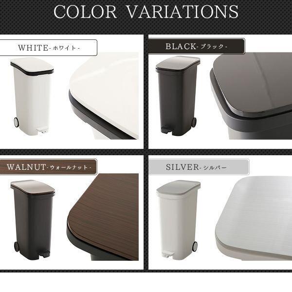 | 【カラー】 ブラック、シルバー、ウォールナット、ホワイト 【サイズ】 幅25.5×奥行40.3×高さ58.8cm 【重量】 2.9kg 【素材】 本体・フタ枠・ホイール・袋止め:PP タイヤ:熱可塑性エクストマー 脚ゴム:SBR ペダル板:PS フラップ:ABS樹脂 ダンパーカバー:ポリアセタール ネジ:ステンレス鋼 作動棒:鋼(三価クロメートメッキ) ダンパー:ポリアセタール・ステンレス鋼・シリコーンオイル 【梱包】 サイズ:幅27.0x奥行42.0x高さ62.0cm、重量:3.2kg 【その他】 容量:31L 【完成品】 届いて直ぐ使えます。 【ご注意】 ・サイズ、重量は概算です。 ・商品カラーはご使用のモニターによって実際の明るさや色と異なって見える場合がございます。 |