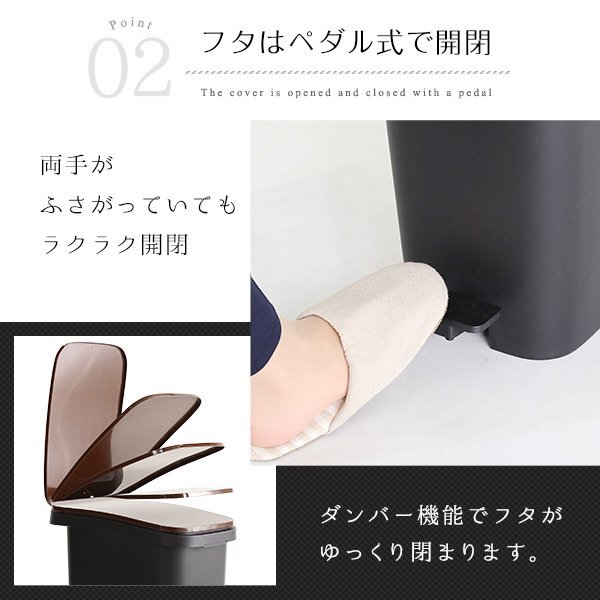 | 【ポイント】 インテリアの邪魔にならないスタイリッシュなデザインです。 キャスター付きなので、ゴミの回収や掃除の際も移動がスムーズにです。 幅の狭いスリムな形状で、フタはペダル式で両手がふさがっていてもラクラク開閉します。 ダンパー機能付きでゆっくりフタが閉まるので静音で安心です。 |
