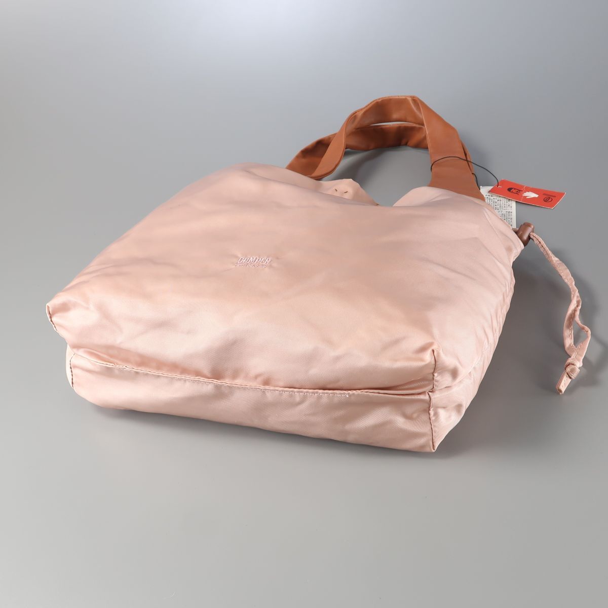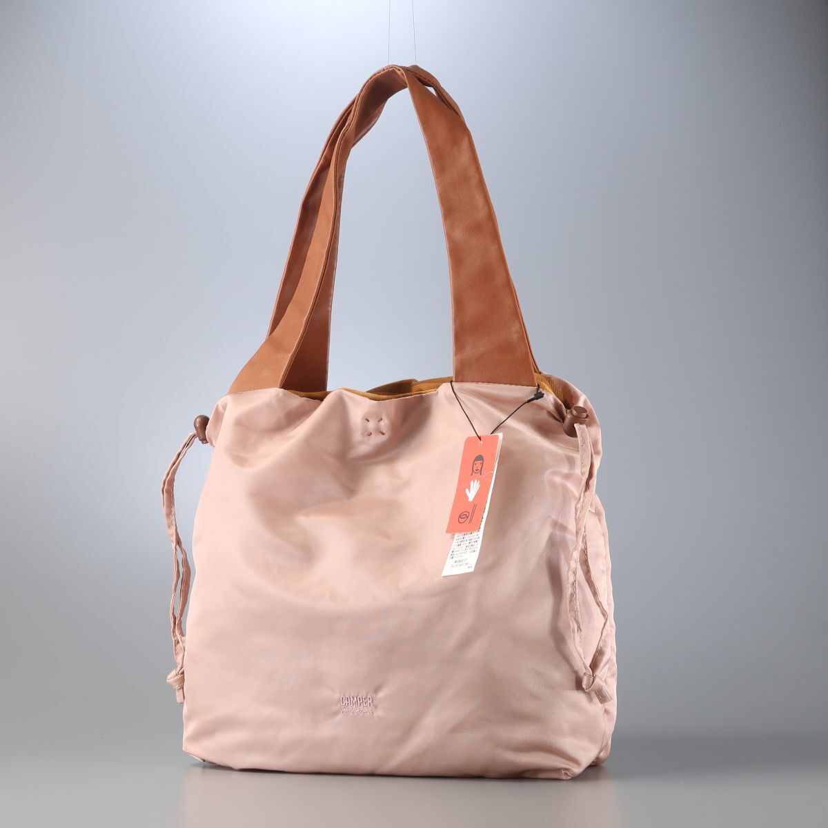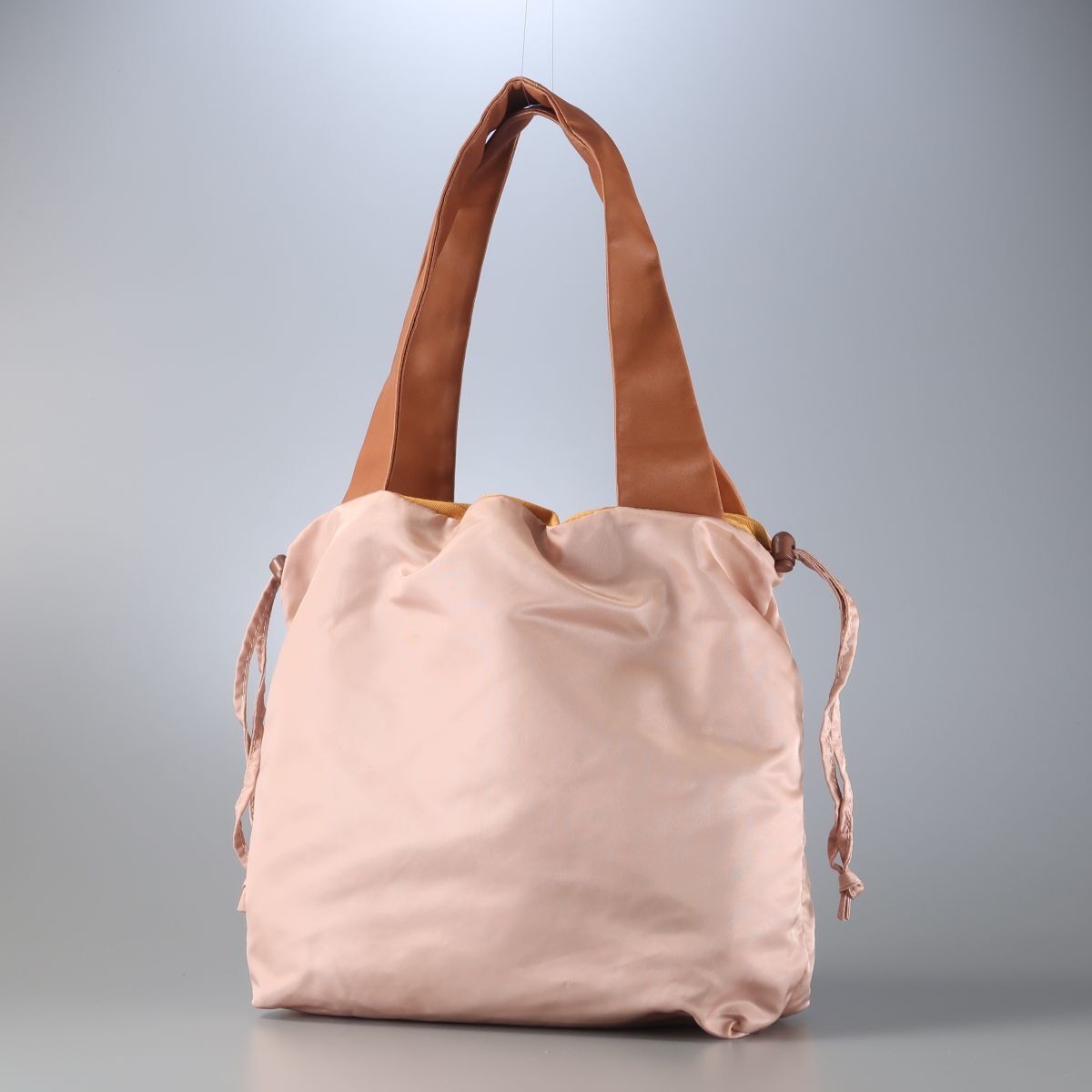 ボーダー柄のキャンバスと、艶のあるピンク系の生地を使用した、軽くて柔らかなリバーシブルトート◎