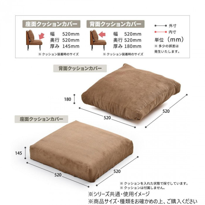 | サイズ | 背クッション:幅520×奥行520×高さ180mm、角クッション:幅520×奥行520×高さ145mm 個装サイズ:52×52×1cm |