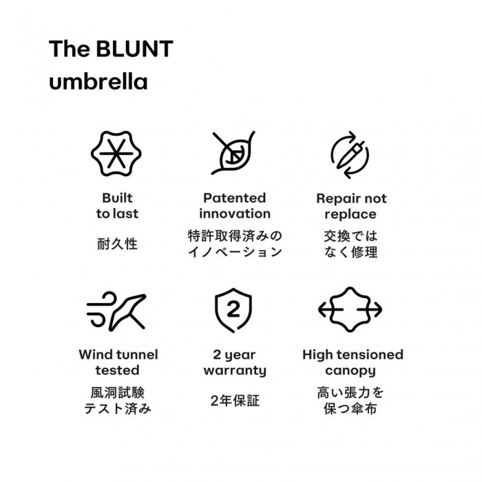 | ニュージーランドで開発された傘ブランド、BLUNTUmbrella。親骨の長さが65cmの大きめサイズです。手開きタイプの長傘です。 |
