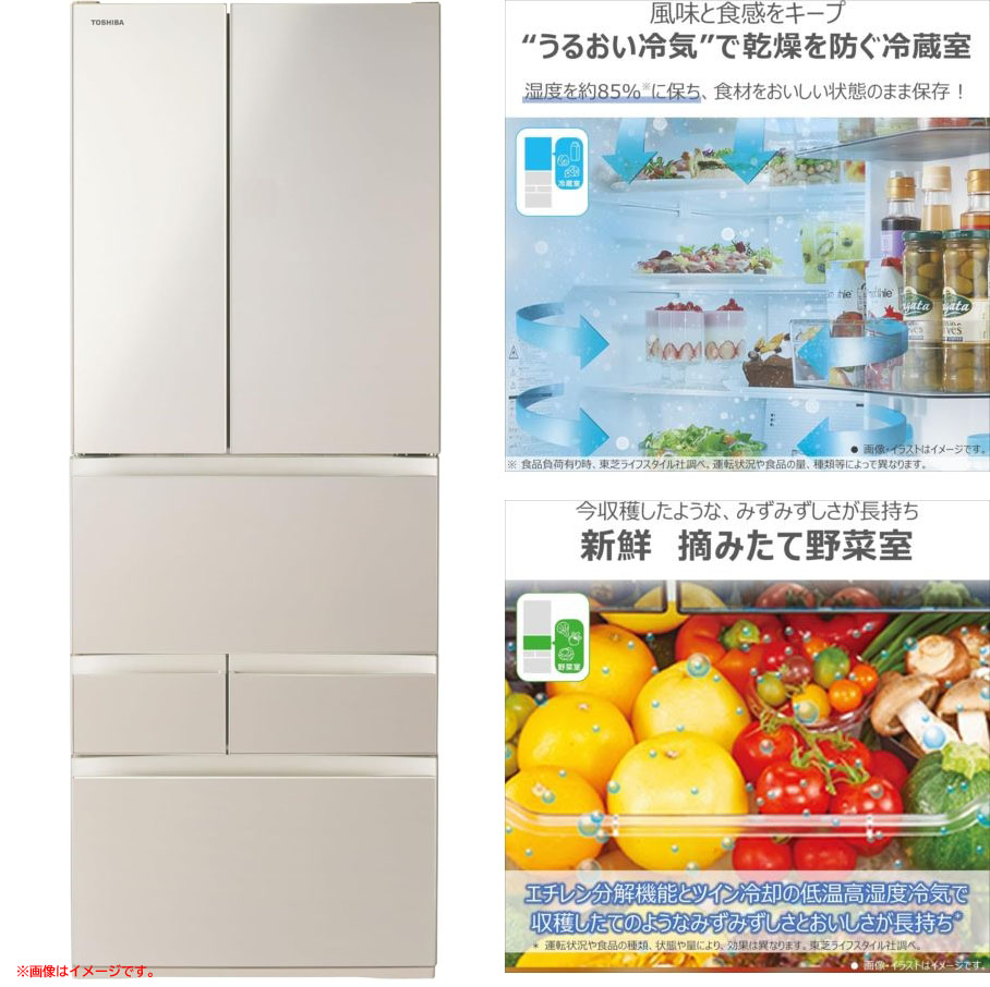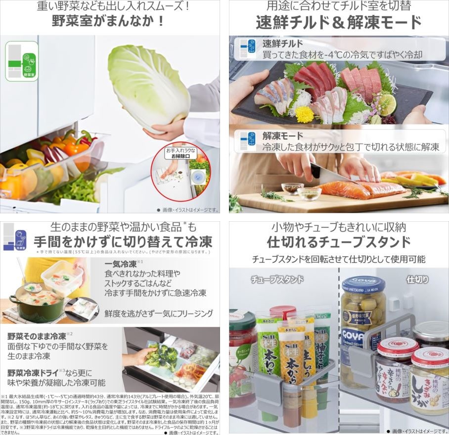 【商品特長】 ◆大容量のスタンダードモデルの冷蔵庫(551L)。 「うるおい冷気」で乾燥を防いで風味と食感をキープ。 ◆見やすく探しやすい2段式の「速鮮チルド&解凍モード」により、上段と下段とで食材を分けて保存できる。 「野菜室がまんなか」で出し入れしやすい。 ◆「仕切れるチューブスタンド」を備え、ドアポケットに設置してチューブ類をすっきり収納可能。 「新鮮 摘みたて野菜室」でみずみずしさが長持ちする。 店舗印の無い保証書が付属致します。 ※弊社店舗印では効力が無い為、白紙のままの発送になります。 | |||||||||||||||||||||||||||||||||||||