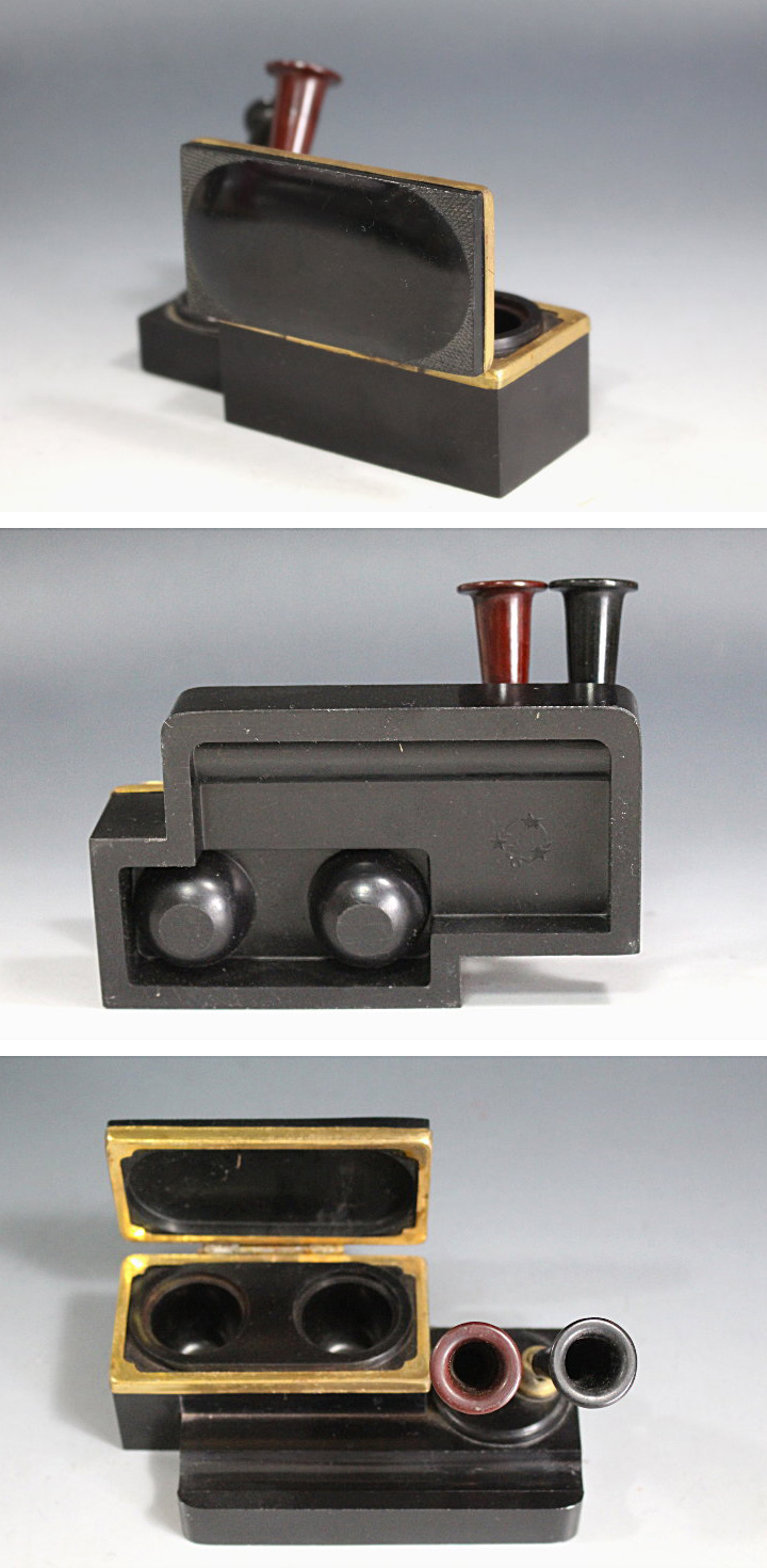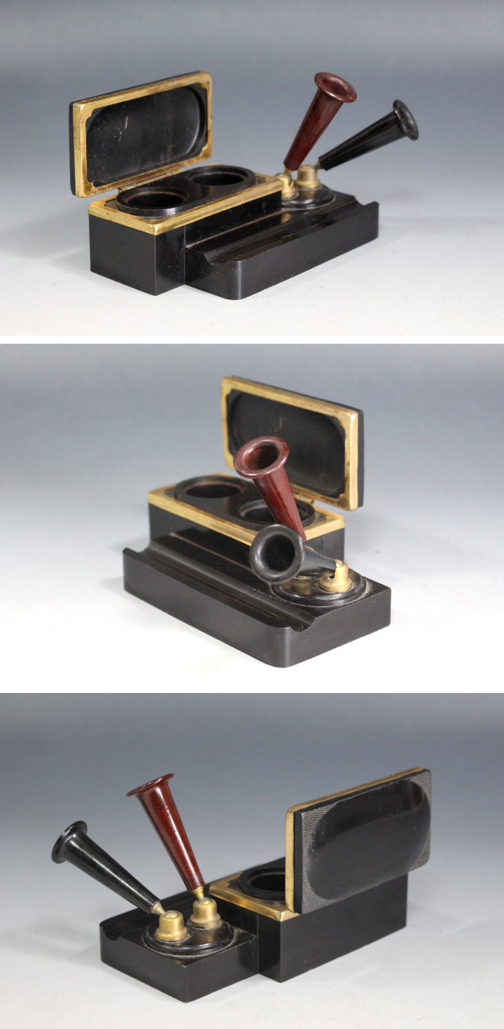 サイズ:底巾11.6cm 古い卓上ペンスタンドです。 蝶番などに錆などがあります。 インクを入れる小さなうつわがありません。 状態は良くありません。 ケース入(傷みがあります) ケースの蓋裏に「王子税務署開應記念」とあります。 写真をご覧の上ご入札宜しくお願い致します。 | |
