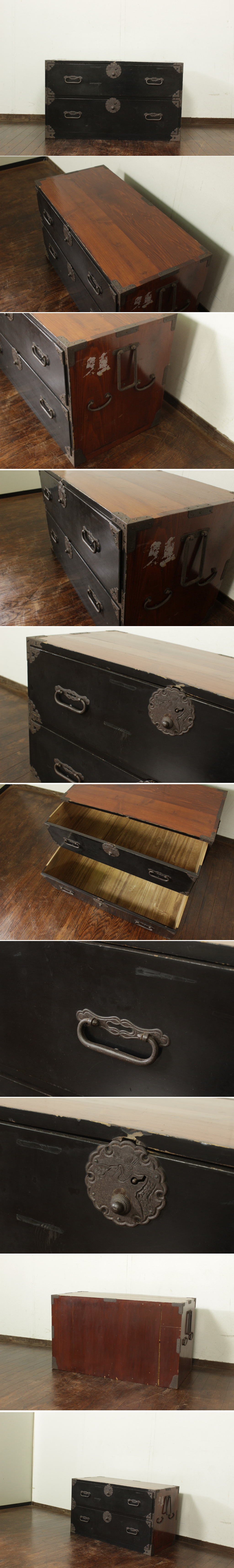 前面は塗膜が褪せて、使いこまれ良い風合い質感です。 特徴的な黒塗りにシンプルな丸型の錠金具、軍配引手も味があります。 使い勝手の良い2杯の引出しデザイン。 収納箪笥としての実用にはもちろん、和レトロなアイテムとして ローボードやディスプレイなどインテリアにもオススメです。 |