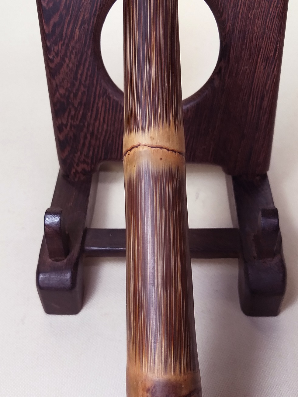 写真をご覧下さい。竹材の模様は、安価な人工印染の模様とは異なります。素敵な天然野生老竹の模様です。50~80年以前には、中国の湖南省、湖北省、雲南省、広西省の沢山の県で、珍貴、稀少な名竹が生息しておりましたが、天候の温暖化による大面積による竹の開花、枯死により、また、欧米市場に出荷のため大量の伐採により、現在では、この種の天然野生紫色金絲実心竹は湖南省天門県の1つの県の山区にのみ少量見られるだけとなりました。ほとんどが人工植樹の幼竹ですが、相場価格は、非常に高額です。野生竹は、ほとんど見られません。