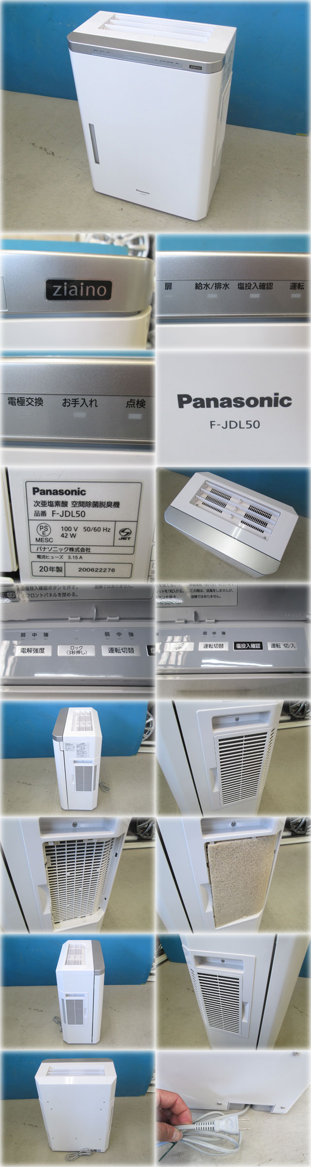 パナソニック 業務用次亜塩素酸空間除菌脱臭機 ジアイーノ F-JDS50-W を出品いたします。 ■特徴■ 年間を通して知っておくべき 菌やニオイ対策。 それは、「次亜塩素酸(電解水)」による 空気の洗浄です。 「次亜塩素酸」とは、 さまざまな分野で活躍する除菌成分です。 すでに幅広く利用され、 実は私たちの身近な成分である次亜塩素酸。 例えば水道水にも浄化処理による 微量の次亜塩素酸が含まれています。 その「次亜塩素酸」を使って空気まで洗うことで、 より確実な除菌対策が可能に。 空間除菌脱臭機ジアイーノは、 水と塩を電解することで 「次亜塩素酸」の水溶液を自動生成し、 室内に置くだけで、手軽に空気を除菌できます また、除菌だけでなく、し尿臭や体臭・ペット臭など 気になるニオイの脱臭能力にも優れています。 実はすでに介護や医療、保育などの 衛生管理が求められるさまざまな施設に、 ジアイーノが選ばれています。 これからの菌・ニオイ対策に、 「次亜塩素酸」で空気の洗浄を。 求めていた除菌・脱臭力が、ここにあります。 電解強度調整機能付 運転モニターとランプの減光機能 操作ロック機能 ■仕様■