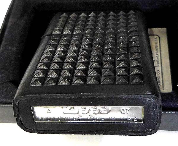 現物写真撮影、この写真の品が届きます。合成皮革巻加工ジッポーで、本革ではありません。一つ一つのマスの4面がピラミット状に加工された集合体ブラック。新品未使用無傷のベスト品。既に廃版になっており今後の入手困難品です。ビンゴが出品している全ての商品は、店頭販売、他オークション販売、ショッピング販売等重複し販売しております。時間差で売れ切れや、出荷点検検等で傷が付いていたり破損している事もあります。従いまして、お買い上げ頂きましても出荷出来ない場合も有りますので、予めご了承の上お買い求め下さい。ご注文商品は他商品と同梱配送出来ますので、何個ご注文されても送料は1口分です。1.レターパック発送 ¥600 日時指定不可。(郵便レターパック)。2.宅配便発送税込み ¥880日時指定必須(沖縄/離島は別途価格)。必ず 受取日時 をご指定下さい。(例:15日 18~20 時必着)再配達防止の為。 (業者は当社にお任せ)。3.代金引換発送引手数料税込み ¥1、210 日時指定必須(沖縄/離島は別途価格)。 必ず 受取日時 をご指定下さい。(例:15日 18~20 時必着)再配達防止の為。(業者は当社にお任せ)。
