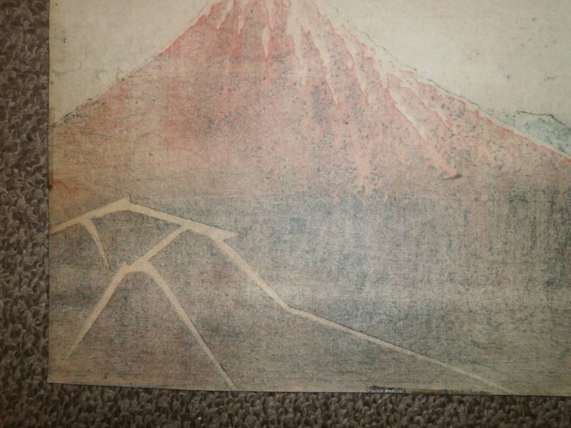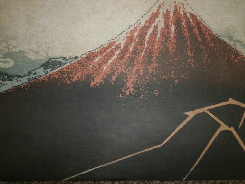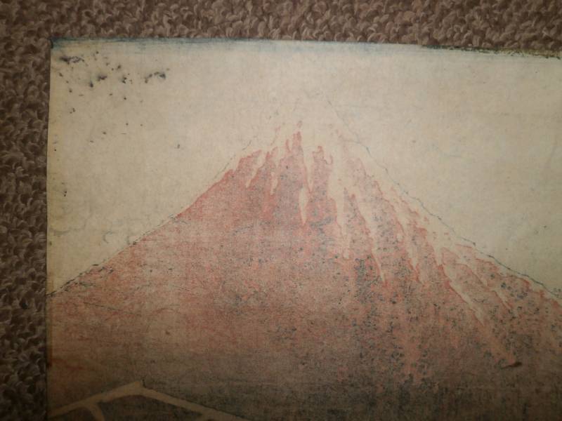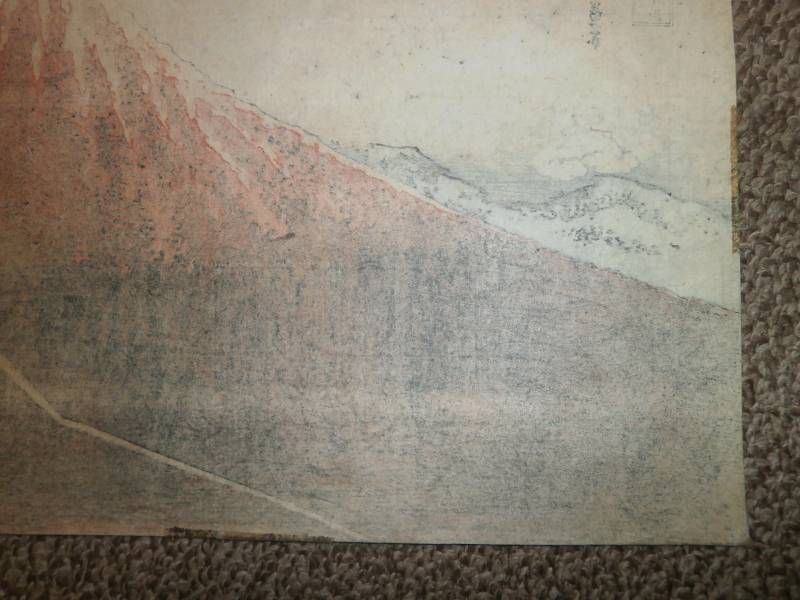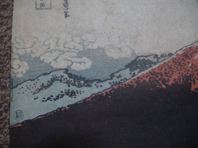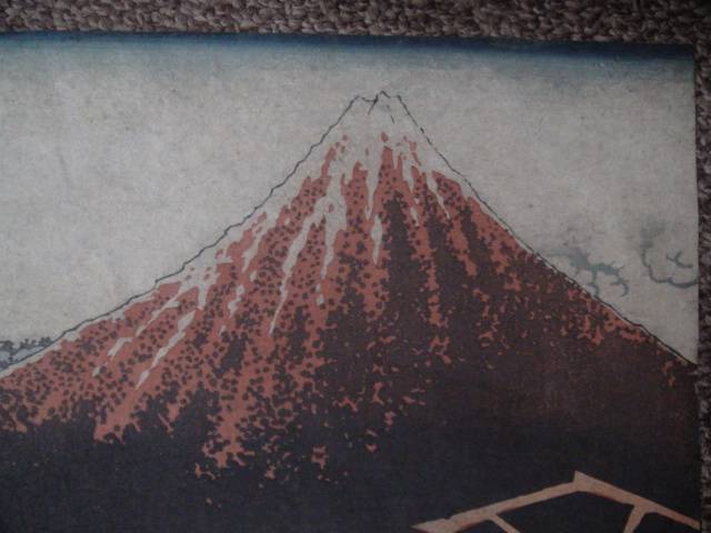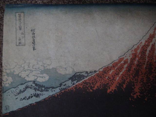サイズ: 縁の紙が額に合わせてちょっと切れてるようですが、縦24Cm 、横36.2Cm、美術館の北斎オリジナルとほぼ一致。