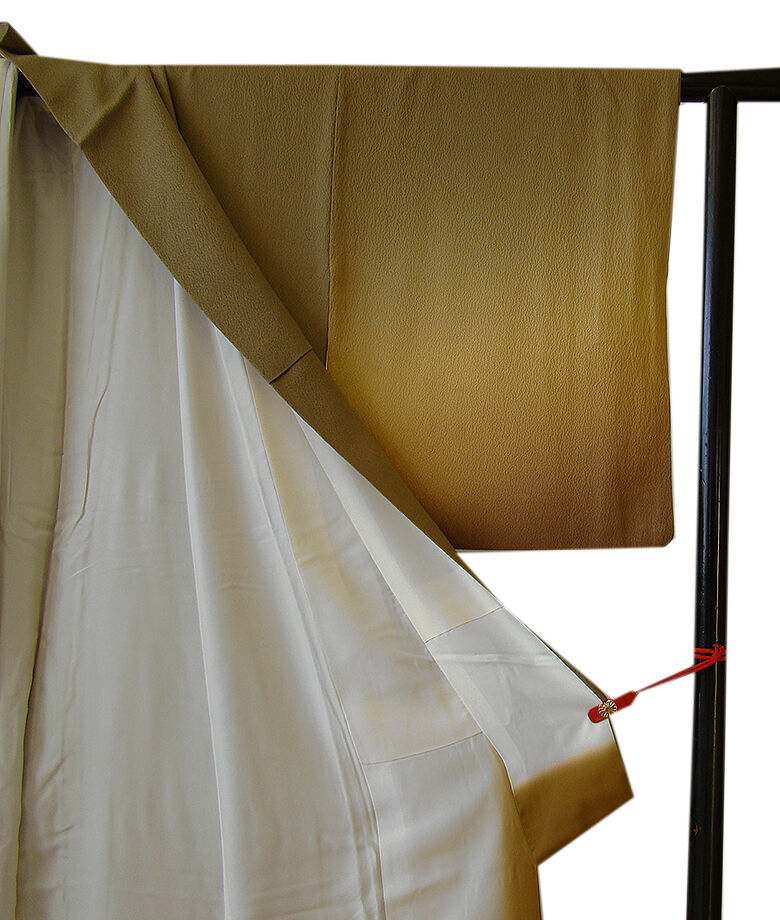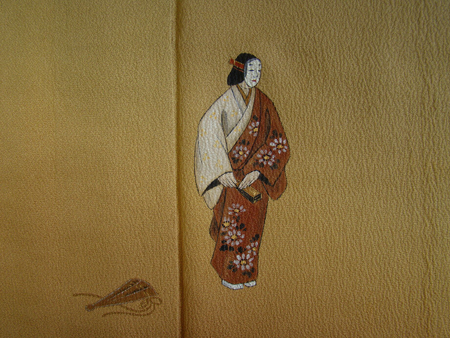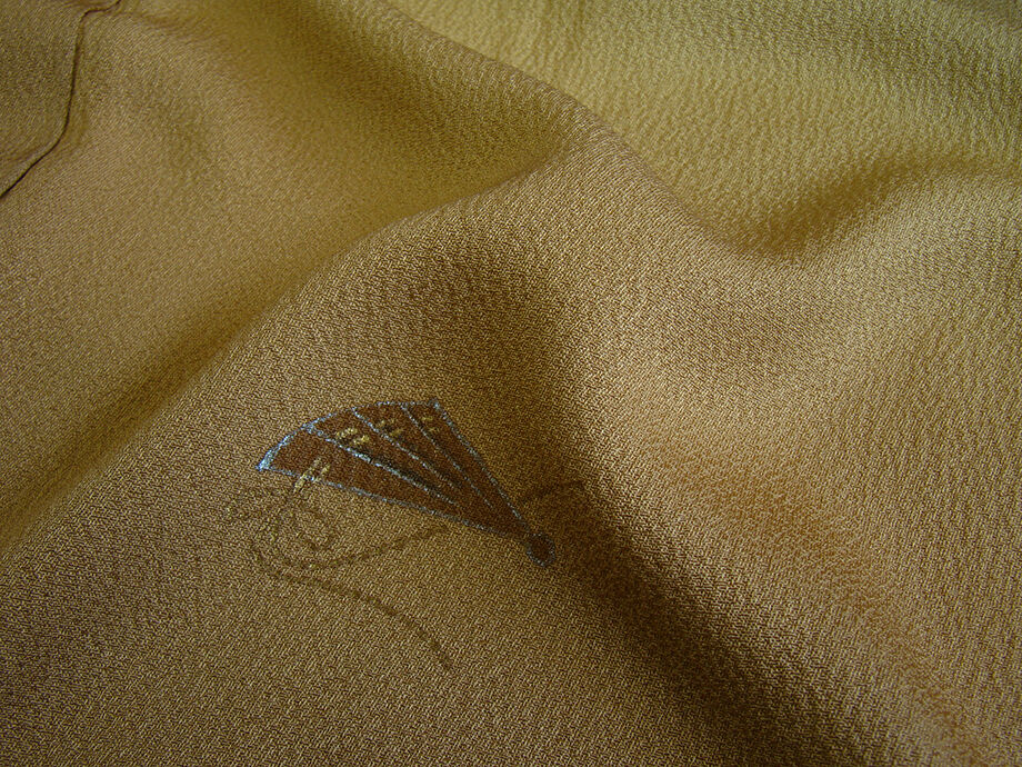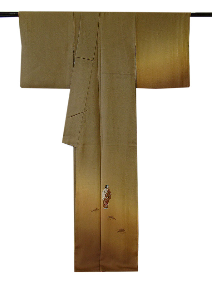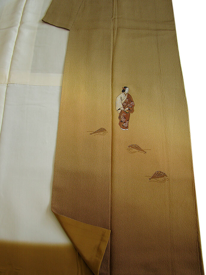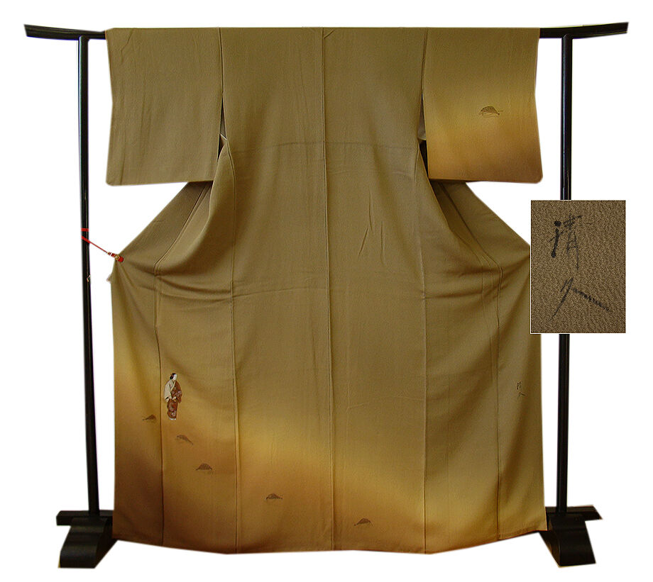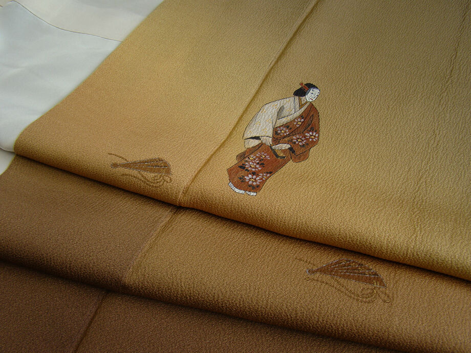 | 商品説明 | こちらのお品は「袷」でございますので、10月~5月までお召頂ければと思います。 大変にしなやかで滑らかな柔らかで着心地良い、重めの極上ちりめん地の生地は、 落ち着きある渋い朽葉色地に裾にかけて焦香色、狐色のぼかし染に 能楽の人物文や扇面柄の染柄に金銀彩加工仕立て、 八掛は黄土色(正絹)、作家の落款入り、幅広い年代の方にお召頂けます。 |