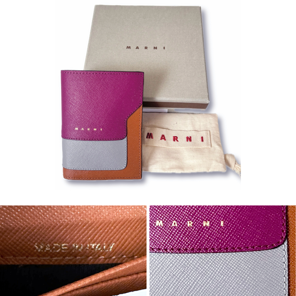 | MARNIらしい個性的なカラーリングで洗練されたデザインの二つ折り財布。機能性も充実しており、コンパクトながらも使いやすさと収納力を両立しています。 |