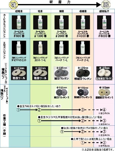 ご参考までに私の会社では、同時出品のコンパウンドも併用しカット1-L → ハード1-L → ハード2-L→カーピカルコンパウンド#6000番の順で磨き、コーティング前の洗車には同時出品の脱脂シャンプーを使用しています。