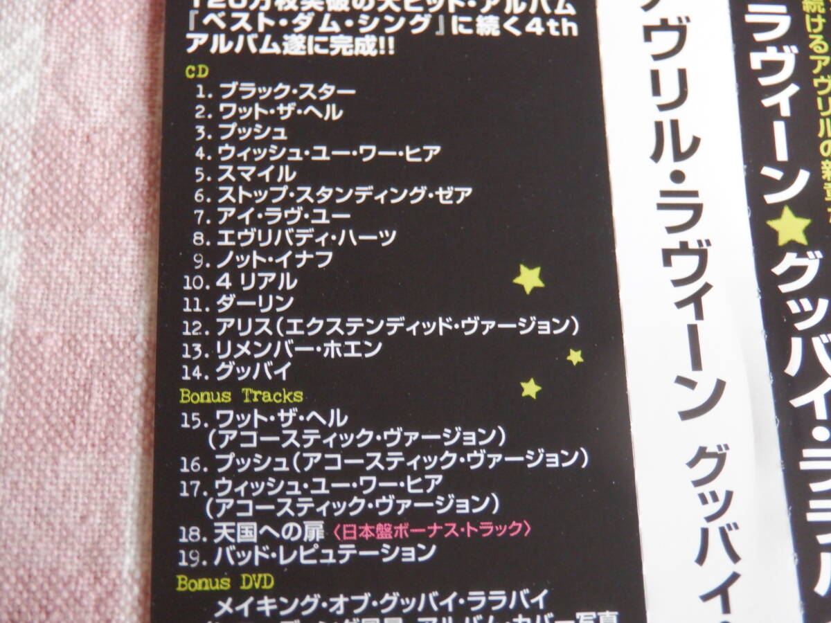 アヴリル・ラヴィーンアルバム『グッバイ・ララバイ~19曲入り』~帯付き・DVD付きになります。CDケースなどにスレ・傷みがありますので、ご理解いただける方のみ入札をお願いいたします。又、盤などの細かいキズ・スレなど気になる方は、入札をご遠慮下さい。長期保管品につきケースなどにスレや傷みがありますので長期保管品にご理解いただける方のみ入札して下さい。長期自宅保管につき、ノークレームノーリターンでお願いいたします。新規の方、評価の悪い方は、こちらの判断で取り消す場合がありますので、よろしくおねがいします。