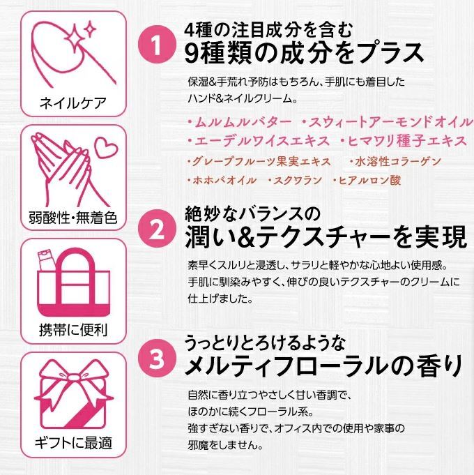 ● 商品内容 乾燥しがちな手や、荒れた指先に素早く浸透するハンド&ネイルクリーム。 もっちりとしたハリ・ツヤ手肌に導きます。 ムルムルバター(保湿成分)配合 ヒアルロン酸Na(保湿成分)配合 エーデルワイスエキス(保湿成分)配合 うっとりとろけるようなメルティフローラルの香り