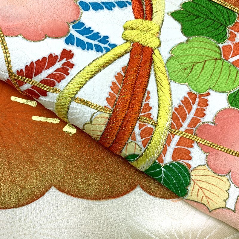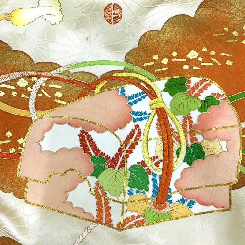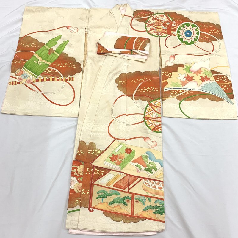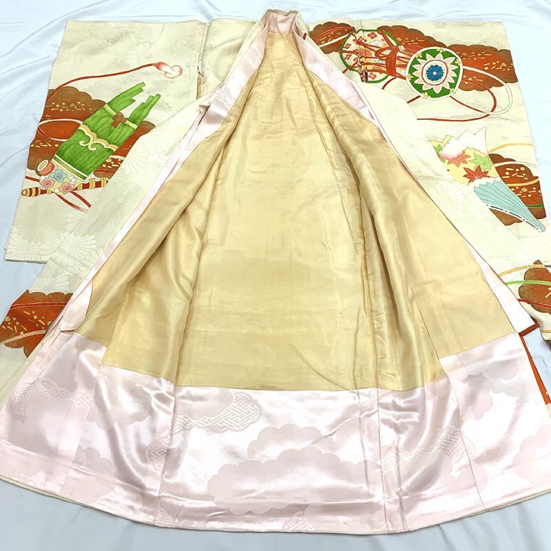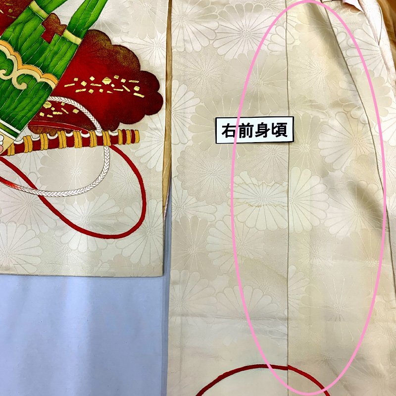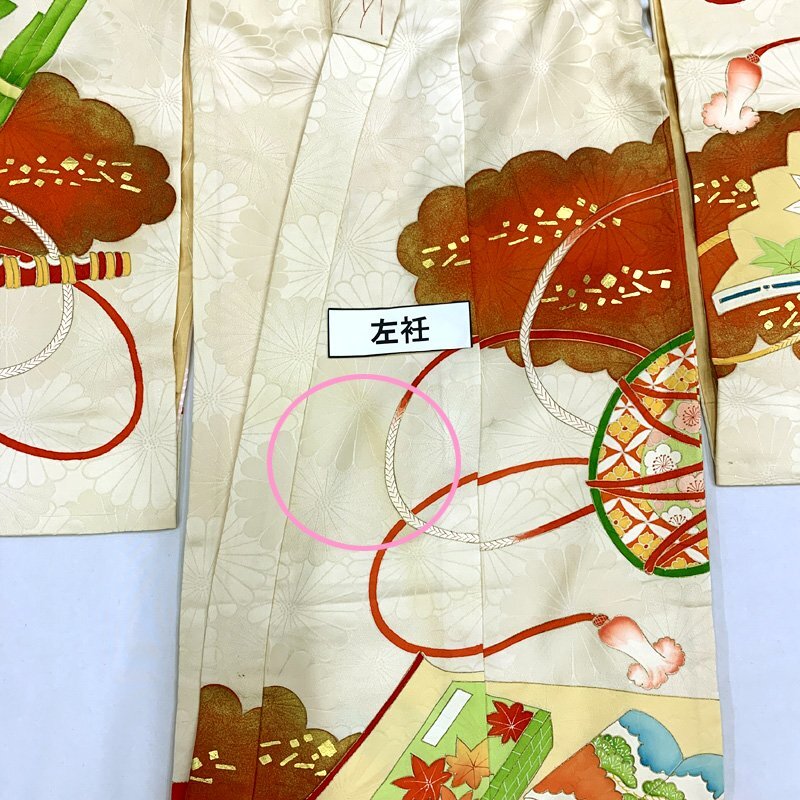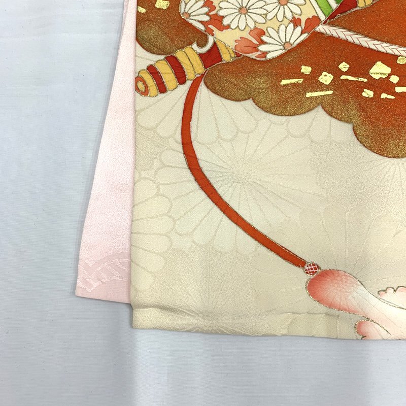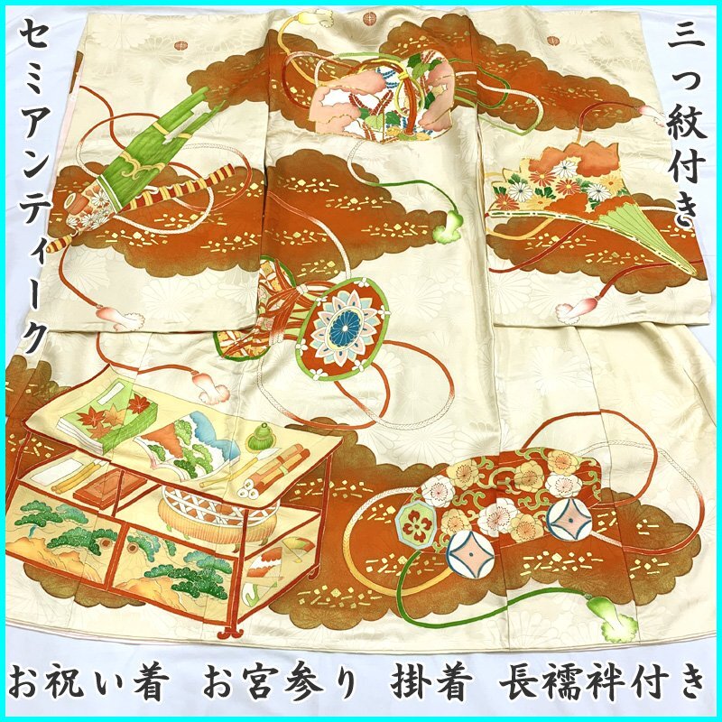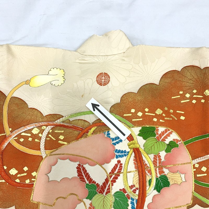 | □お宮参り 女児 セミアンティーク 祝い着 着物 長襦袢付 七五三にも□状態良好 生成り系の地に、金駒刺繍や金彩、刺繍が施された玉手箱や花扇や鼓などのレトロなセミアンティークのお宮参り用の女の子のお祝い着です。長襦袢付き。三つ紋付きで、紋の種類は『対い蝶』です。 USED品で、左右の前身頃にやや変色がうっすらございますが、近くで見ないと分からない程度です。また、後身頃の家紋近くにシミがございますが遠目からみたらあまり目立ちません。胸紐に変色がございますが一部ございますが着用時見えません。 【素材】(着物)正絹 (長襦袢)ポリエステル 【色】生成り系 *モニターによって色味は実際と異なる場合がございます。 【サイズ】(着物) 裄:47cm、袖丈:58cm、身丈(肩から):99cm *素人採寸のため、多少の誤差はご容赦ください。 お宮参りの掛け着としてはもちろん、七五三の3歳のお祝い着としては、お直しや被布と草履などのお小物類をご準備ください(肩上げ、腰上げは手縫いで簡単にできます) 。 | |