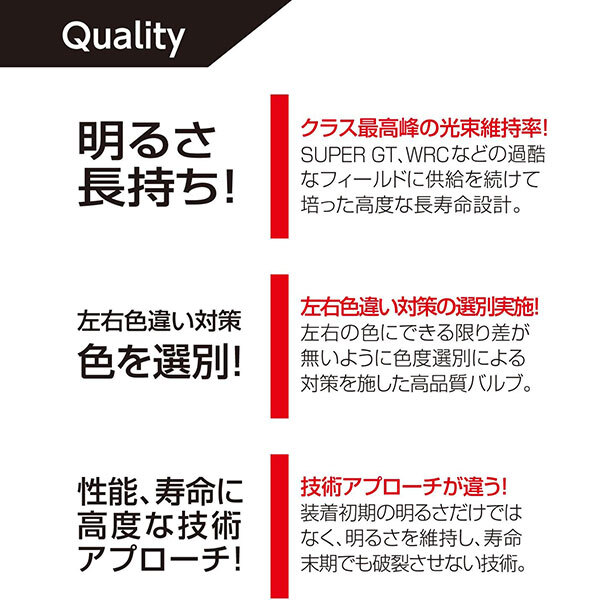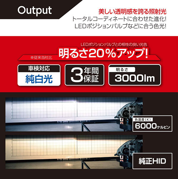 | D2R/D2S共用 HID 6000K 純正交換HID 6000K 明るさ約20%アップの最新HIDバルブ! ●明るさ約20%アップ6000K! ルーメン値を約20%高めた最新HIDバルブです。(※従来当社製品 HL601/602比) さらにLEDポジションバルブなどに合う色光に進化!LEDポジションと「色を合わせる」などのトータルコーディネートがしやすい色光です。 一般的な純正HID 4000K前後に対し、純白光6000Kを実現!車検対応品です。 ※「色を合わせる」につきましては、光源が異なることや灯具仕様により、同色にすることはできません。色の方向性を近づけるイメージとしてご了承ください。 ※画像はイメージです。 ※オープン価格です。 ※記載のルーメン値は、バルブ2個(車両1台分)の値です。 ![]() |
