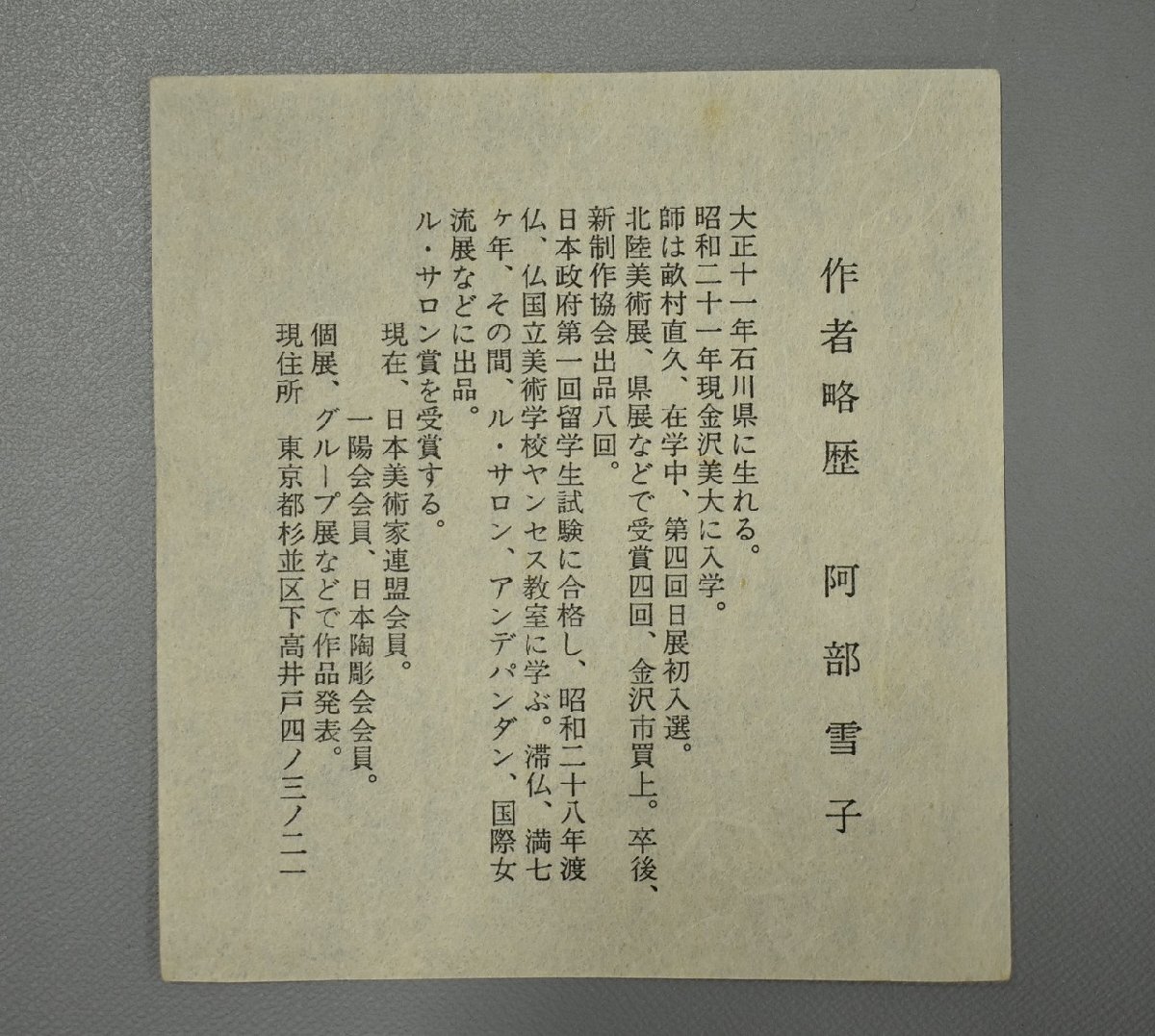 | ★商品説明・詳細など★ | ■彫刻家 阿部雪子 YUKIKO ABE 男性 裸体 ヌード 銅像 ブロンズ像 全高49cm 約4.9kg 一陽会 石黒宗麿の姪 師:畝村直久 *商品落札後のお支払期限は4日以内とさせていただきます。 4日を過ぎるとキャンセルとなり、自動的に【悪い】の 評価がつきますので御注意下さい。 ご理解の程、宜しくお願い致します。 ■USED品 ・ヒビや割れ等の大きな破損はありません。 ・保管による擦れやくすみ、薄汚れがあります。 ■重量 約4.9kg ■寸法 全体:幅15 奥12 高49cm 像のみ:幅13 奥9.5 高47cm 台座:幅15 奥12 高2cm (参考程度にお考え下さい。) ≪商品発送サイズ≫ ゆうパック 【 120サイズ 】 での商品発送です。 【発送元:石川県】 【配送料】はこちら→ ゆうパック送料(郵便局公式HP 180サイズ以上30kg以上の配送は佐川急便のみの配送となります。 【配送料】はこちら→ 佐川急便 飛脚宅配便送料(佐川急便公式HP) ※ゆうパック及び佐川急便公式HPで送料を明記してある場合は送料に関するご質問はお答えできません。 ●画像に映っているものが商品及び付属品の全てです。他に付属品はございません。 ●オークション落札後の品の状態等の質問はお答えできません。必ず入札前に質問をお願いします。 ●商品説明と商品画像に相違がある場合は画像優先にてご判断ください。 ●商品の状態は説明欄、商品画像にてご確認くださいませ。 ●送料や配送方法、商品の状態をご確認の上お客様のご判断でご入札をお願いいたします。 ≪絵画の出品に関するルール改定≫当店も新ルールにしたがい絵画の出品方法を一部変更致しました。 ●(1)特定の作者の作品としている場合は、真作または模写と明記すること。 ●(2)特定の作者の真作としている場合は、万が一真作でない場合に返品を受ける旨を商品説明に明記すること。 ●(1)について、真作でないものは、最悪第三者による模写の可能性があるため、全て模写として出品いたします。 ●真作を出品する場合は、真作であることを明記し、万が一真作でない際には返品を受ける旨を商品説明に明記すること。(ノークレーム・ノーリターンの対象外商品です。) |