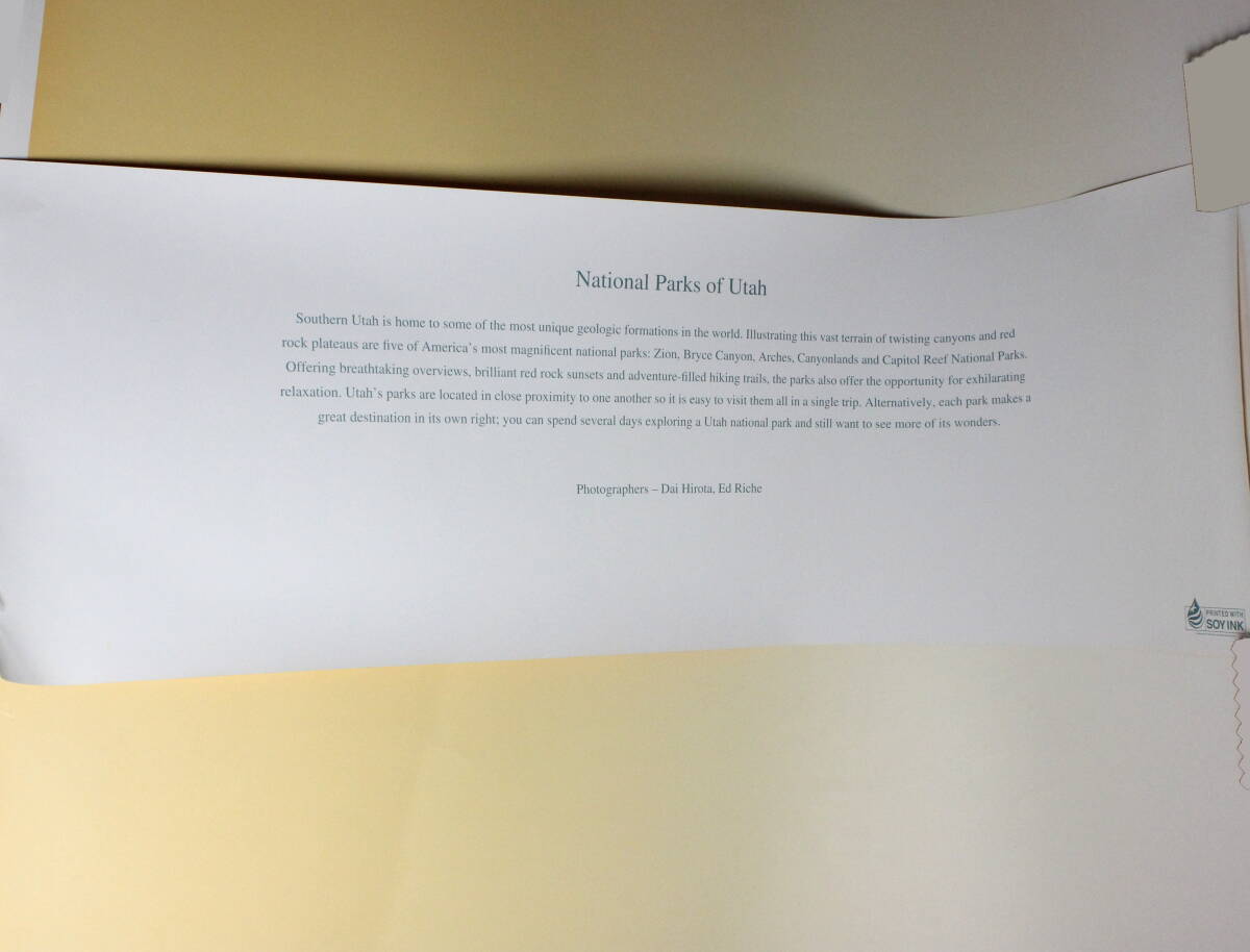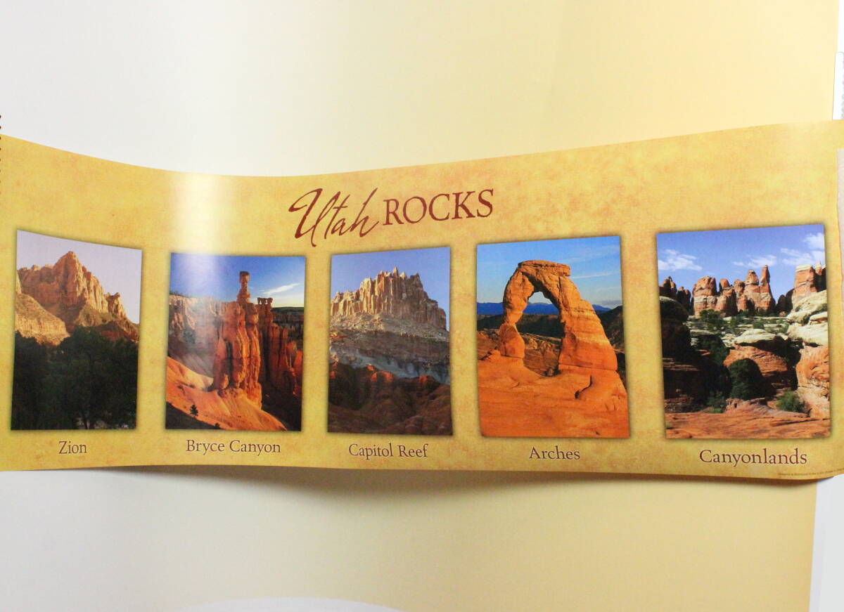 アメリカ・ユタ州 奇岩地帯 5大国立公園 長尺横長ポスターアメリカ西部ユタ州に点在する5つの国立公園。ザイオン、ブライスキャニオン、キャピトルリーフ、アーチーズ、キャニオンランズ。奇岩が作り出した絶景の美しい写真を並べたポスターです。キャピトルリーフ国立公園 のビジターセンターで購入したお土産です。