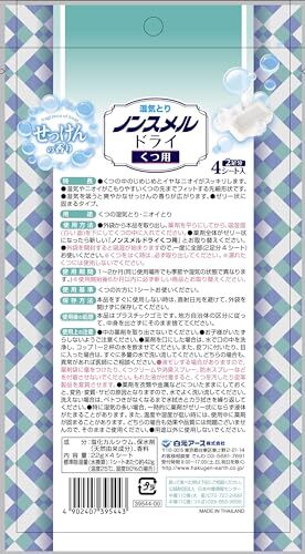 「ノンスメルドライくつ用 せっけんの香り 除湿 脱臭」▼4902407395443▼(商品説明)パッケジ個数:1・先細形状でゼリ状に固まるせっけんの香りのくつ用除湿剤・商品サイズ (高さ×奥行×幅): 22mm×130mm×235mm・ブラント名: ドライ&ドライUP・メカ名: 白元アス(株)・原産国名: タイ王国商品紹介 ・くつの中のじめじめとイヤなニオイがスッキリします。 ・湿気やニオイがこもりやすいくつの先までフィットする先細形状です。 ・湿気を吸うと爽やかなせっけんの香りが広がります。 ゼリ状に固まるタイプ。 使用期間 1~2?月(同じ使用場所でも季節や湿気の状態で異なります。 使用開始後6?月以内に必ず新しい商品とお取り替えください。 保存方法 本品をすぐに使用しない時は、直射日光を避けて、外袋を開けずに保存してください。 使用上の注意 使用上の注意 ●中の薬剤を取り出さないでください。 ●お子様がいたずらしないようご注意ください。 ●薬剤を口にした場合は、水で口の中を洗浄し、コップ1~2杯の水を飲ませてください。また、皮フに付いたり、目に入