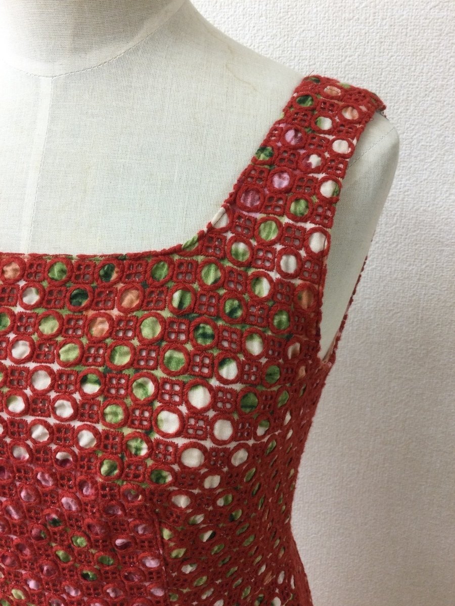 | 管理番号:10^135964 シビラ ノースリーブワンピース 赤透かし模様とボタニカル柄生地重ね 表示サイズ:M 実寸(参考)