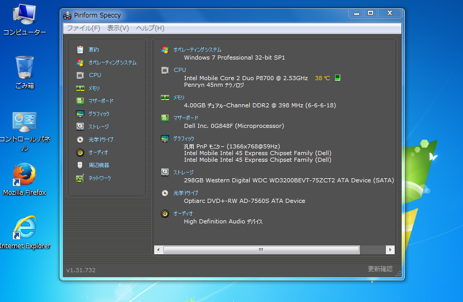 ストレージ(HDD) | 320GB HDD ソフトでチェック済--正常 SSDへの変更をおすすめします。 HDDに比べると起動やファイルの読み書きが大幅に高速になるだけでなく、 省電力、軽量、耐ショック性、低発熱のメリットがあります。 |
