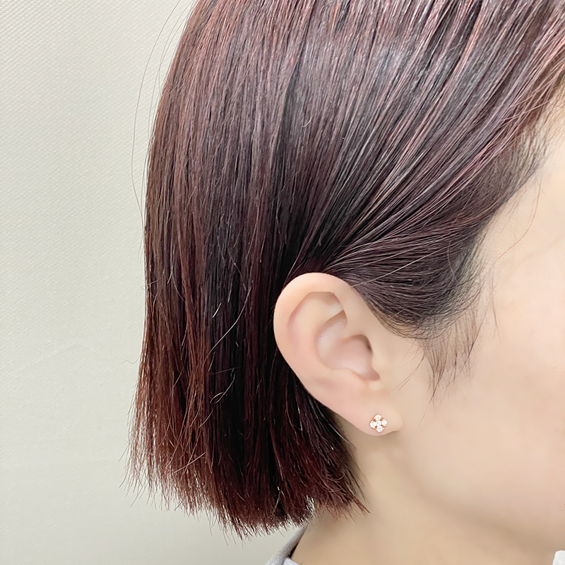 | サイズ | カラット 0.17ct × 2個 約 5.3 mm ※ダイヤに合わせて製作しておりますため、若干の誤差がございます。何卒ご了承くださいませ。 厚み 約 2 mm ※ポスト:長さ 約 10.0 mm/太さ 約 0.8 mmです。 重量 約 0.8 g |