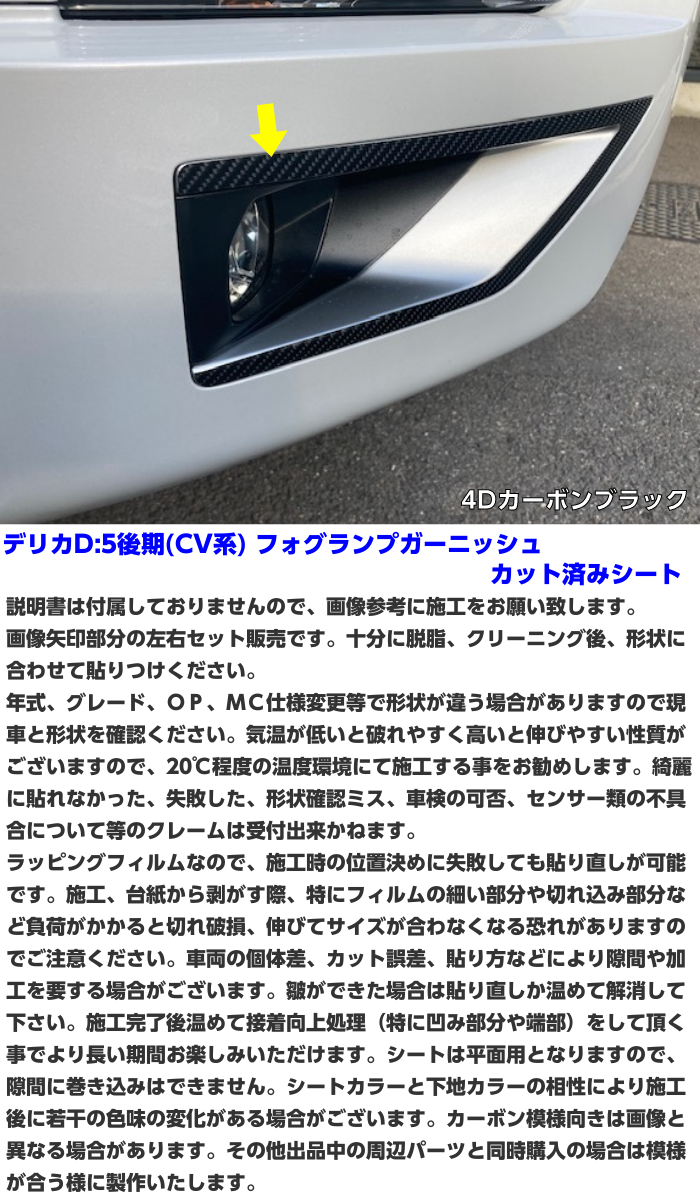 ②デリカD:5 CV系後期適合 カット済みなので、張り付けるだけの作業で見た目が変わります。 グレード、オプションの有無、年式、MC仕様変更等で形状が違う場合がございますので、現車形状確認の上ご注文をお願いします。 形状確認ミスによるクレームは受付できません。 カラー、種類、は落札後にご希望の商品をご連絡ください。