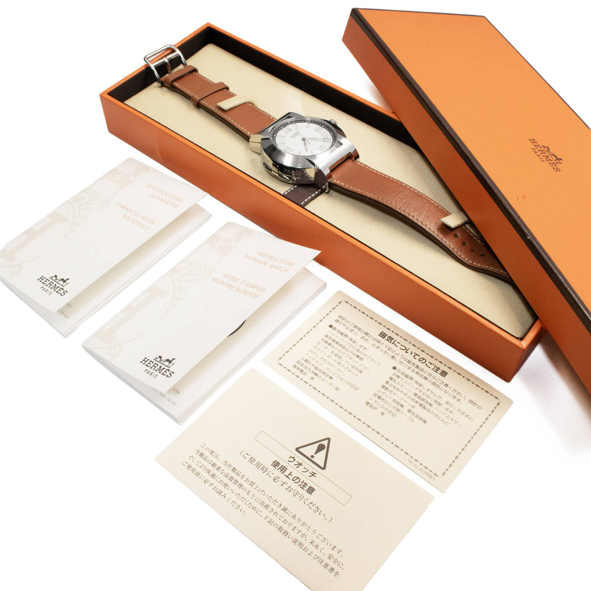 送料無料 エルメス 腕時計 オートクォーツ メンズ ノマードコンパス N02.910 白 茶色 大型 目立つ ロゴ マーク 革ベルト 蓄電池 綺麗 Q134