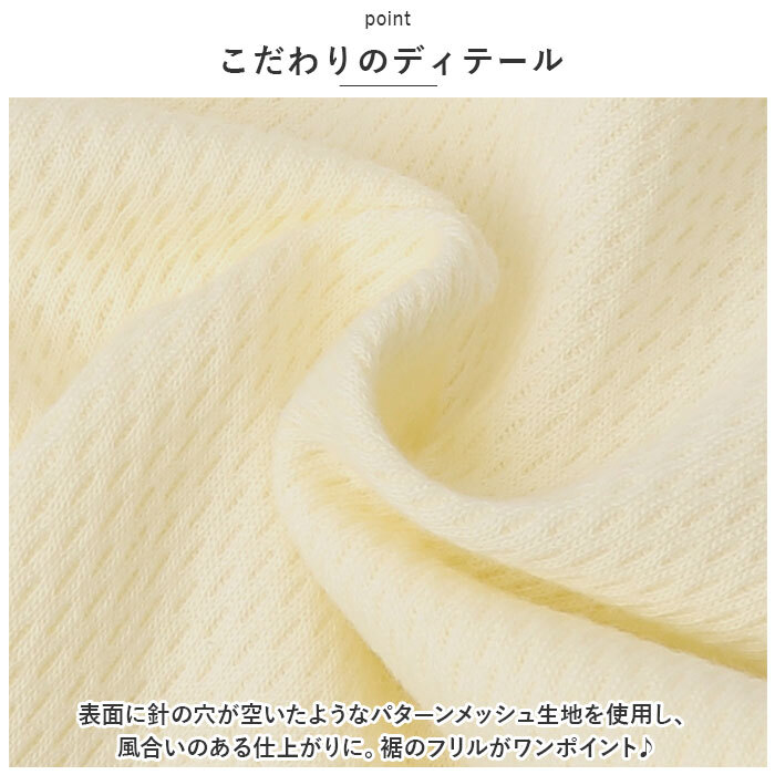 | 商品説明 | ・・コーデにアクセントをプラス♪Aenakから、可愛らしいベーシック7分丈レギンスが新登場。 ・【入園・入学準備に】 ・デイリー使いしやすい、7分丈のベーシックデザイン。どんなアイテムにも合わせやすいのが嬉しい! ・【こだわりのディテール】 ・表面に針の穴が空いたようなパターンメッシュ生地を使用し、風合いのある仕上がりに。裾のフリルがワンポイント♪ ・【肌に優しい綿100%素材】 ・柔らかく、デリケートな肌にも優しい安心設計。汗も吸収するサラッとした手触りで、夏場も快適な着用感◎ ・【色んなコーデと相性ばっちり】 ・適度なハリ感で普段着にはもちろん、チュールスカートなどのキレイめお出かけコーデにも♪ ・【ふんわりナチュラルカラー】 ・温かみのあるカラーをラインナップ。色違いで揃えればコーデに合わせた使い分けを楽しめたり、洗い替えにも便利。 ・【うれしい6サイズ展開】 ・成長に合わせて選べる6サイズ。姉妹でリンクコーデもおすすめ! |