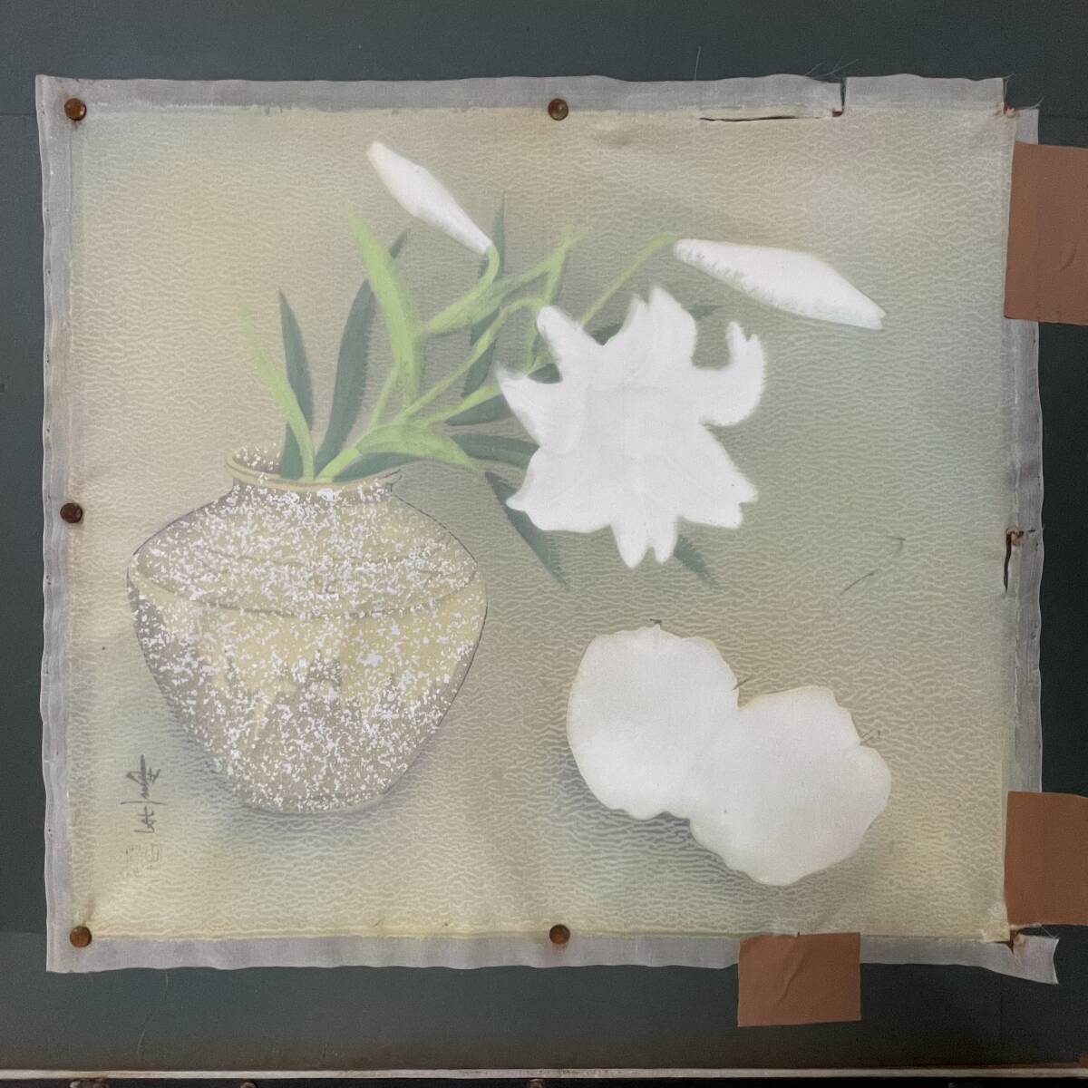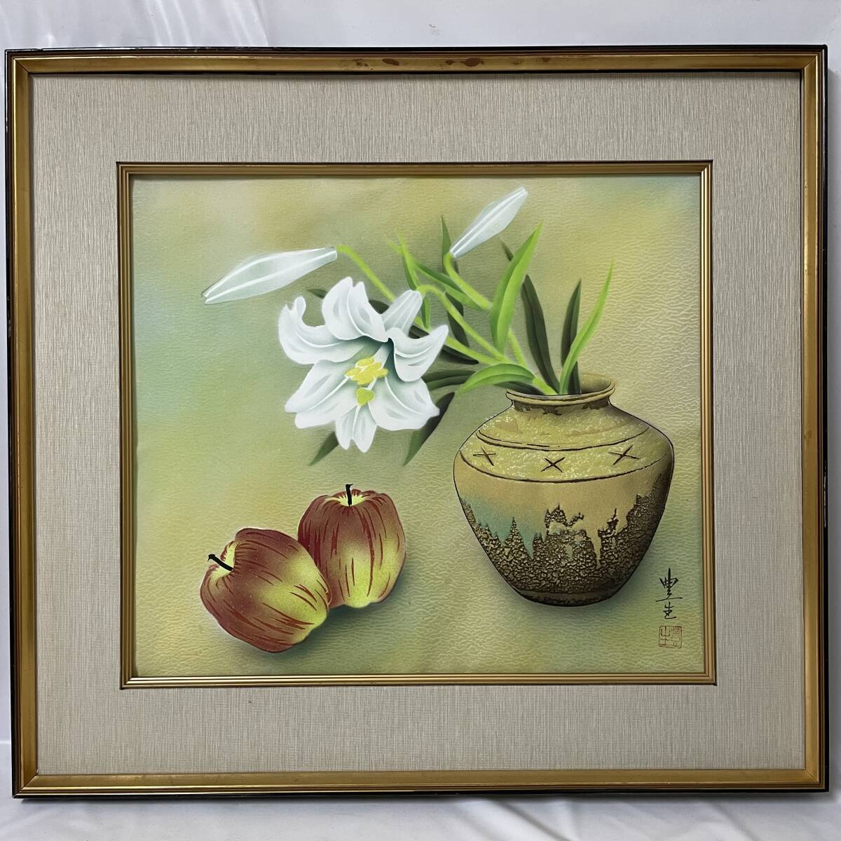 中古品です。 額に汚れなどございます。 ※前面はガラスになります。 撮影の時は写りこみをなくす為に外してあります。 画本体は裏面で画鋲、ガムテープにて固定されておりますが 多少たるみが見えます。 現状品です。 写真にて状態の確認をお願いいたします。 その他細かな詳細は画像参照にお願いします。 扱っている商品は骨董品や中古品を扱っております。 極端に目立つ欠損は説明文・画像にて表記致しますが、 多少スレ・キズ・汚れなどがある品としてご理解下さい。 |