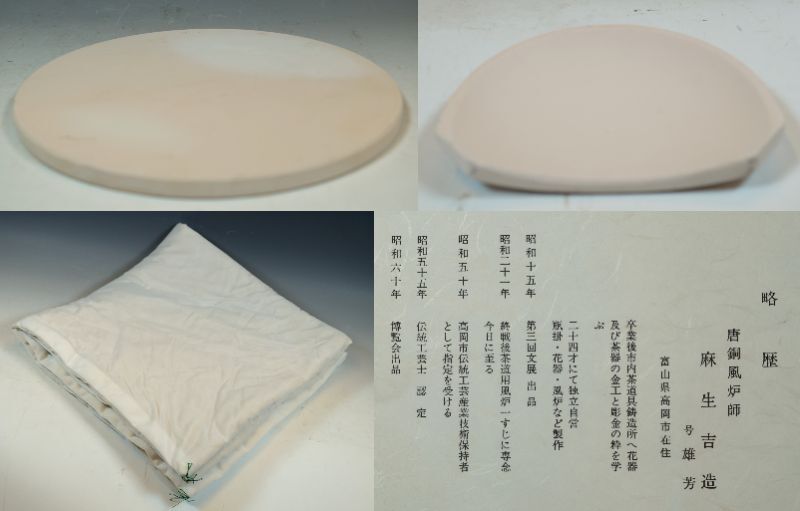 | 商品説明 | ■風炉師 麻生雄芳 唐銅面取風炉 虫喰五徳/前瓦/敷瓦添の出品で御座います!!!■ ☆風炉 高さ 20.5cm 径 34cm ☆五徳 高さ 11cm 径 21.5cm ◆旧家/茶道の先生よりお譲り頂きました! 多少古いお品物とご理解頂いた上での入札をお願いします。 経年の擦れ/汚れ/小傷等はご了承お願いいたします。 小さな傷など全て説明しきれない場合もございますので 画像にて判断ください。 PC環境により色など実物と多少誤差が生じる場合があることを予めご了承ください。 神経質な方のご入札はお控えください。 撮影用の皿立て等は付属致しません。 (写真参照でご判断お願いいたします) ◆落札後、24時間以内にご連絡いただけない方のご入札お断りいたします。 ◆落札後 5日以内のご入金をお願いいたします。 ■支払方法 かんたん決済のみで御座います。ご了承お願い致します。 ■発送はゆうパックのみで御座います! ■領収証の発行は致しておりません! ◆商品到着後 お受け取りのご連絡を必ずお願いいたします! 商品を受け取られましたら迅速に商品受取完了の御連絡を御願い致します。 ■ 発送完了時に評価をいたしますので 不要の方は事前にお知らせください! ☆ゆうパック : 120サイズで配送いたします。 ゆうパック料金は下欄に記載いたしております。 .発送はゆうパックのみで御座います。 【【【重要】】】 ★【真作】 真作であると保証できる作品を 真作と表記いたします!!! リトグラフ/木版画などの版画作品なども対象となります。 ★【模写】 真贋の判断が出来ない場合 模写と表記致します! ☆保証期間内に商品が真作でないと判断された場合は 落札金額/送料/鑑定代金等をご返金いたします。 ☆返金請求をされる場合 その証明として下記の書類等が必要となります。 ※贋作と証明された該当商品 ※所定鑑定機関または公式鑑定人が発行した書類(原本必須/コピー不可) 公的鑑定機関発行の鑑定(証明)書 作家自身の署名捺印のある書面 等 ■ 評価が5以下の方 新規ご入札の方は質問欄で購入のご意思をご連絡お願い致します! (ご連絡なき時は削除させて頂く場合もございます。) ■ 画像でのご判断いただきご納得いただける方のみ入札ご参加願います。 ◆ 梱包材一部・新聞紙等をリサイクル使用しますので ご了承お願いいたします。 ◆ 開封後に商品に問題が御座いましたら 評価を頂く前にご連絡お願いいたします。 最善の解決努力をいたします。 ■ヤフーオークション新規の方は基本的にお断りいたしておりますがご 希望の方は質問欄でご意思をお伝えください!!!! ■ 当方千葉県市川市で骨董/アンティーク店経営いたしております。 お近くの方は店頭でご覧下さい。 また店頭でのお渡しも可能ですのでご相談ください。 他にも多数出品しております。 : 自己採寸ですので多少の誤差はご了承ください。 : 神経質な方評価の悪いが多い方のご入札ご遠慮ください。 :詳細は質問でお願いいたします。 :写真をよくご覧になってご入札をお願い致します。 :店舗でも販売いたしておりますので入札後に出品取り消し させて頂く場合もございます。ご了承お願いいたします。 注意事項 ・ご落札後、24時間以内にご連絡いただけない方のご入札お断りいたします。 ・5日以内のご入金をお願いいたします。 ・マイナス評価、キャンセル歴の多い方はご入札を取り消させて 頂く場合もありますのでご了承願います。 ・店頭でも販売致しておりますので売り切れ等で入札があっても 取り消す場合がございます。 ・同梱発送に付きましては混乱等を回避する為、同日の落札分のみとなっております。 ・ご不明な点等ございましたら、入札前に質問欄より、お問合せ下さい。 (終了直前、時間外等々でご質問の対応が出来ない場合が御座います) 千葉県市川市市川2-6-14 TEL: 047-325-1603 |