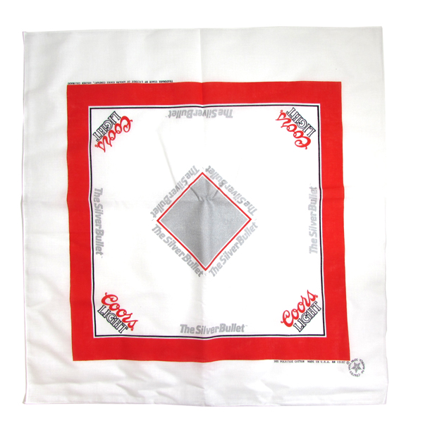 ・アメリカのビール「Coors Light」柄バンダナのデッドストックになります。縫製は4辺ともロックミシンで仕上げられております。この手のバンダナは54cm程度のサイズ殆どですが、こちらは60cmと大きいサイズです。