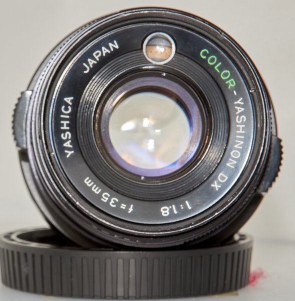 レンズは富岡光学の「COLOR-YAHINON DX 1:1.8 f=35mm YASHICA JAPAN」(4群6枚構成、1.8-16)です。