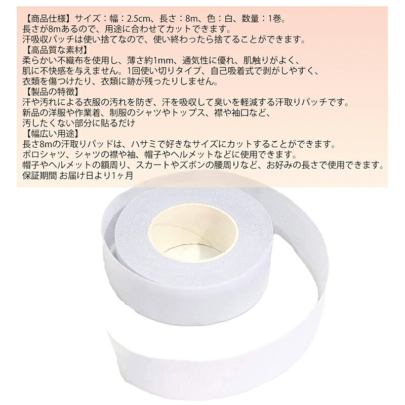 長さが8mあるので、用途に合わせてカットできます。 汗吸収パッチは使い捨てなので、使い終わったら捨てることができます。
