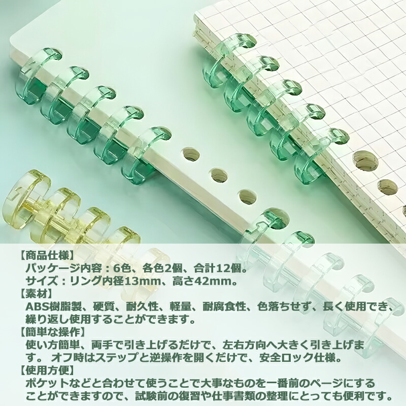 【商品仕様】パッケージ内容:6色、各色2個、合計12個。サイズ:リング内径13mm、高さ42mm。