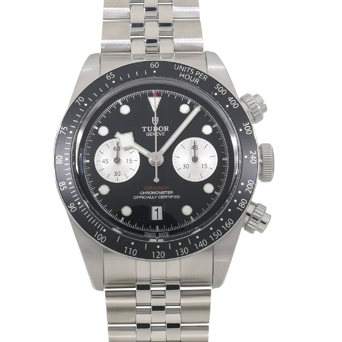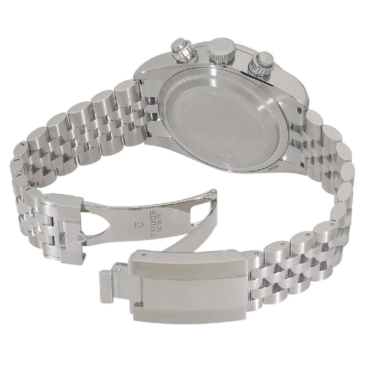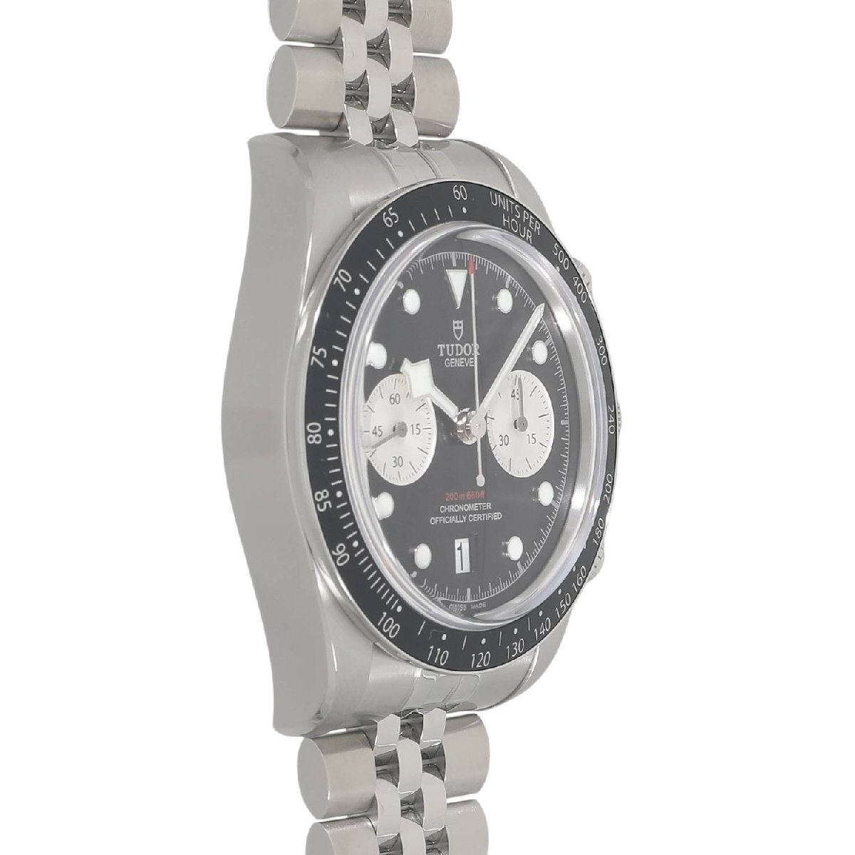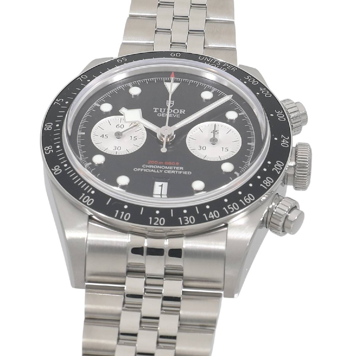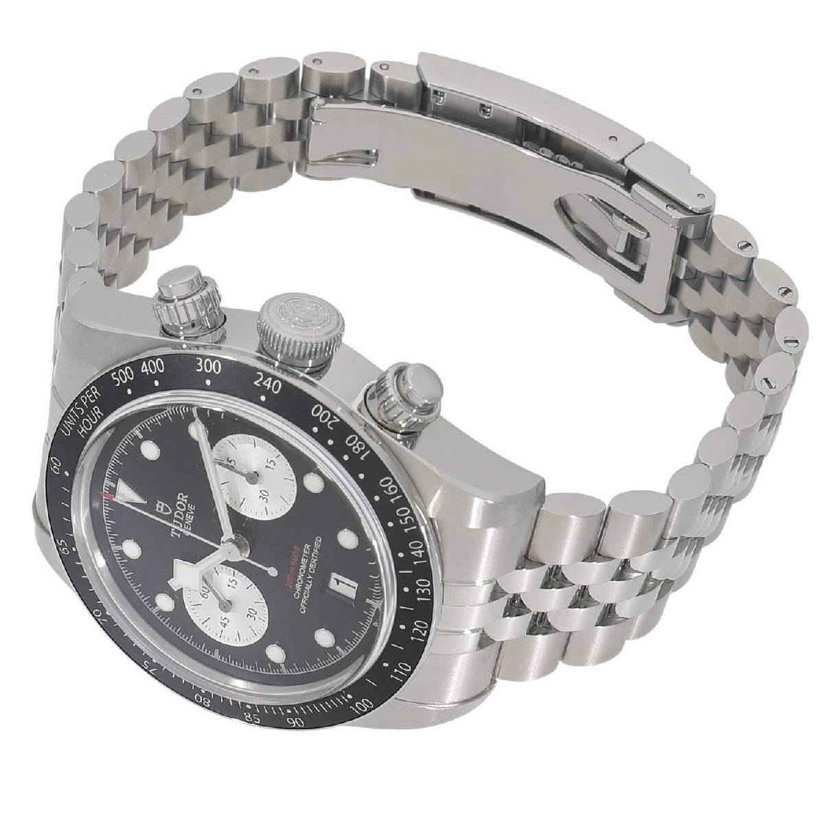| モデルについて | 2025年の新作 チューダーのアイコン的コレクションとして、人気のブラックベイシリーズ。ブラックベイらしくダイバーズウォッチの流れを組んだケースデザインに、モータースポーツのイメージを結びつけるストップウォッチ機能を備えるクロノグラフモデルが2019年に発表されます。ステンレスケースを採用したブラックベイクロノグラフは、2021年にラインナップに加わり、更に高い人気と支持を得る事になります。2025年の最新仕様では工具を使わず8ミリの長さを5段階で簡単に調整できるT-fitクラスプへと変更されました。 |