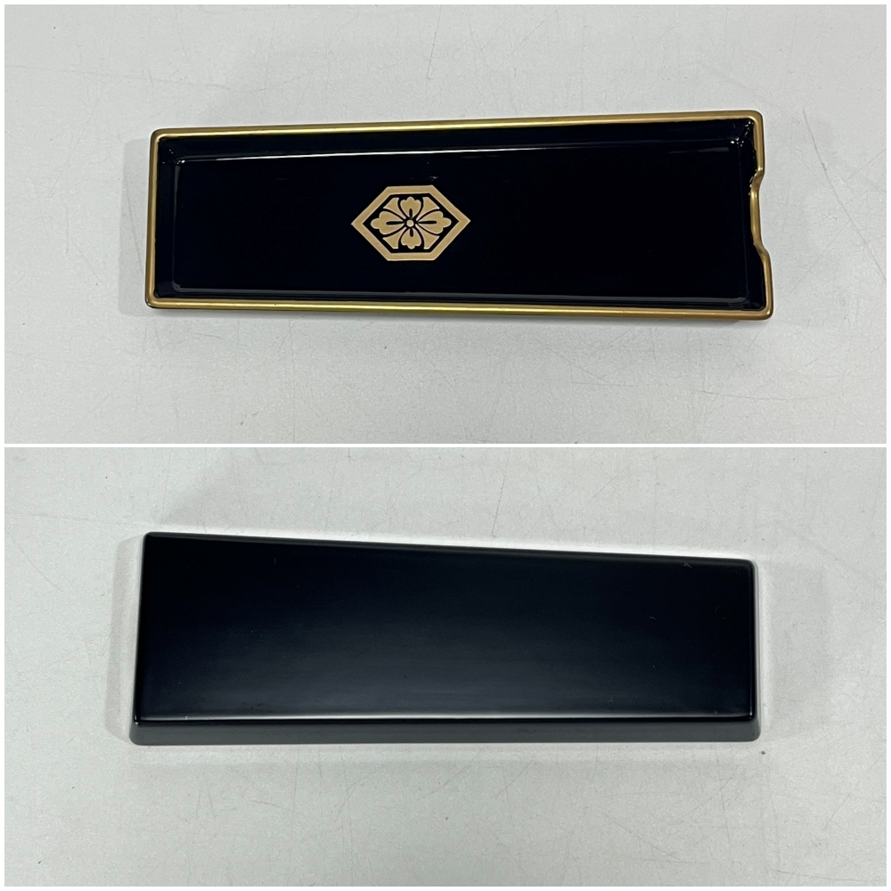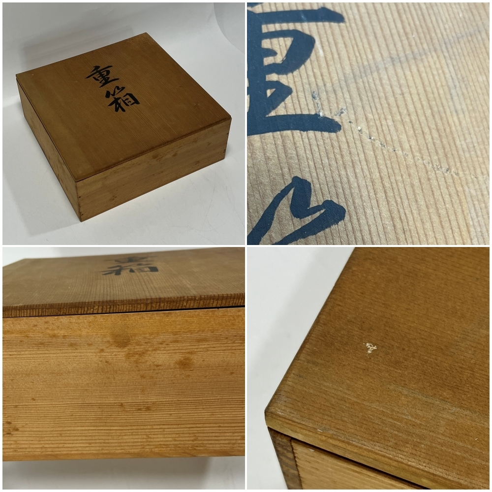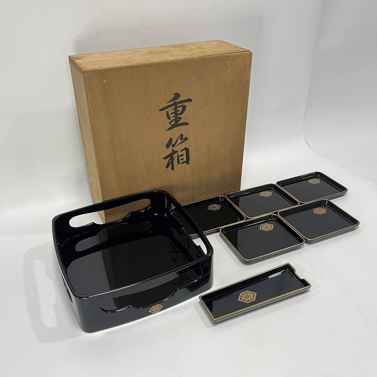 未使用 天然木 重箱セット 7点 紋入り 和風 お祝い事 盆 フチ金 トレイ 経年保管品 現状品の出品です。