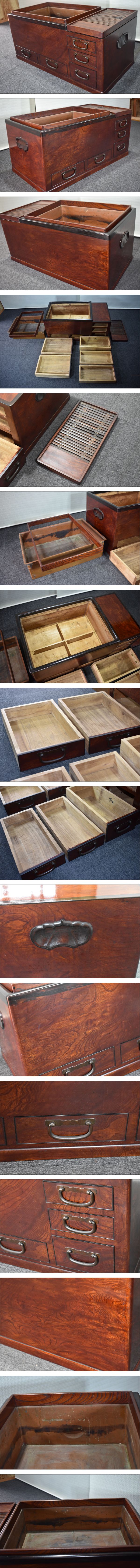 美しい杢目の欅泡杢無垢材、黒柿縁の5杯抽斗の大振り時代江戸前長火鉢です。吹き漆に良い風合いの色艶で、縁部に使用された黒柿が美しい欅材の杢目を際立たせております。全体的に厚みもあり、杢目の良い、良質な材質が使われております。熟練の職人ならではの丁寧な造り、一流木工職人の卓越した技術と拘りを感じ取ることができる逸品です。和室の火鉢としていかがですか・・・存在感ある見事な逸品です。その他、ご使用に問題のある大きなダメージ等は御座いませんが、あくまでも時代物となりますので、古い物にご理解頂ける方のみご入札下さいますよう宜しくお願い致します。 サイズ W907 x D473 x H428 2022年7月からのシステム変更に伴い落札後に電話番号が表示されなくなりましたが、発送先の電話番号は必須項目となりますので落札後に取引メッセージ欄より必ず電話番号をお伝えください。 ※個人出品ですから消費税は頂きません。 ※今回出品する品物は写真の物ですべてとなりますのでご了承下さい。 ※動作保証します。 (万が一初期不良が発生した場合は全額返金する事をお約束致します) ■重要なお願い(必須)■ 落札後取引ナビから配達当日に繋がる「電話番号」をお知らせ下さい。 (電話番号がないと発送できません。) | |||