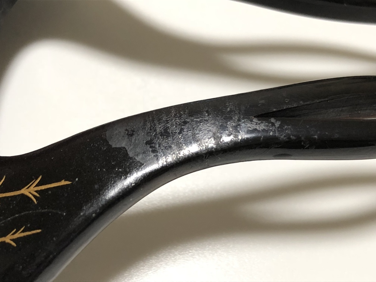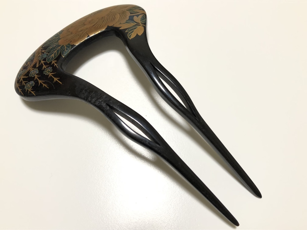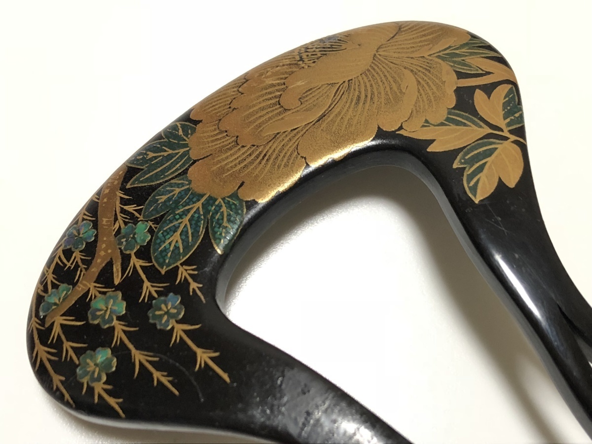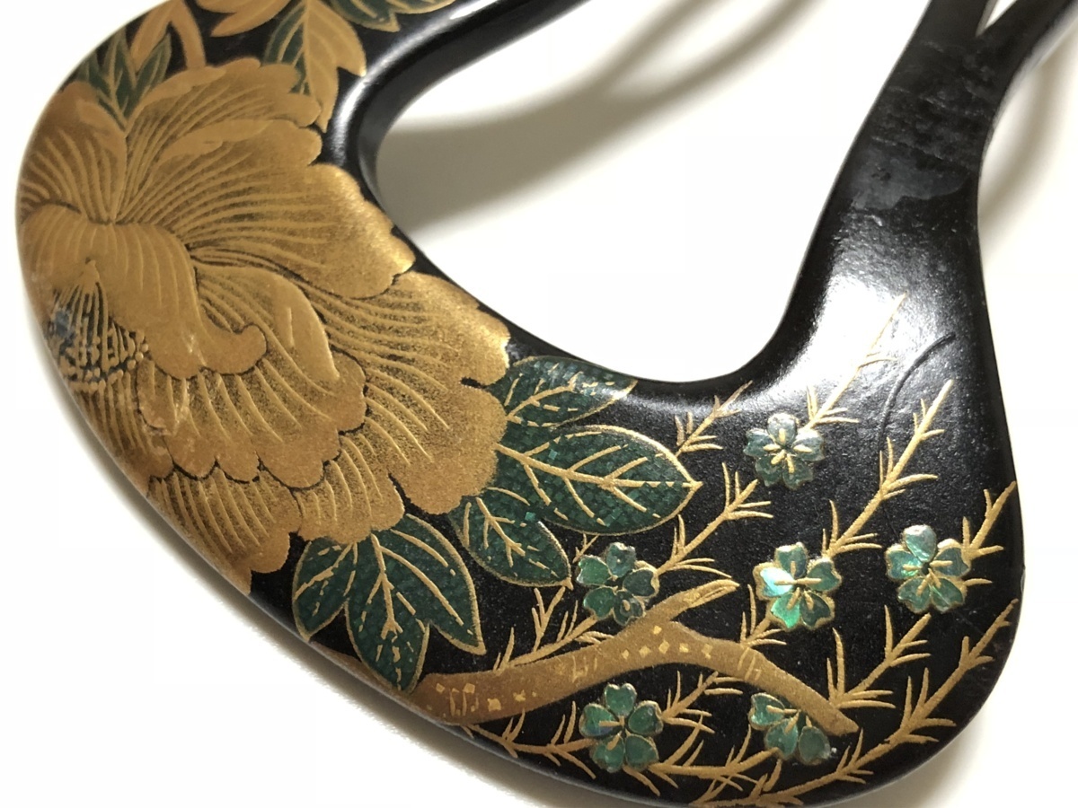 アンティークの黒甲の本鼈甲を使用し、金蒔絵、螺鈿を施した、枝垂れ桜牡丹文の大振りの扇簪です。擦れて半分消えておりますが、作者、光俊の銘があります。鼈甲部分に欠けや虫食いはありませんが、全体的にくすみ、汚れがあります。