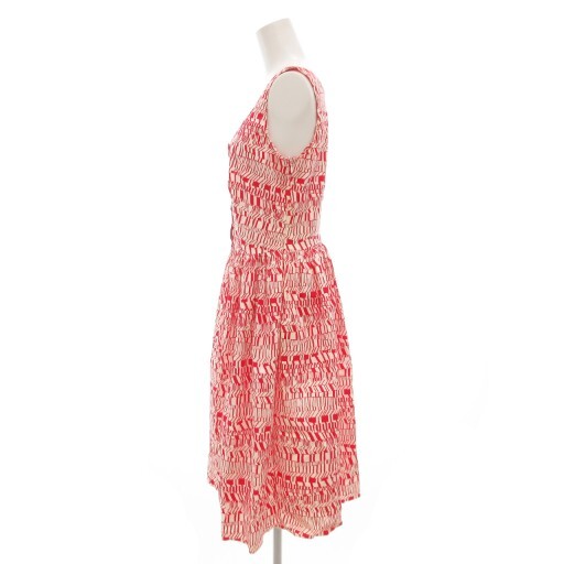 プラダ PRADA ワンピース ノースリーブ ギャザー ひざ丈 総柄 ストレッチ 40 赤 レッド 白 ホワイト /GV ■GY18 レディース