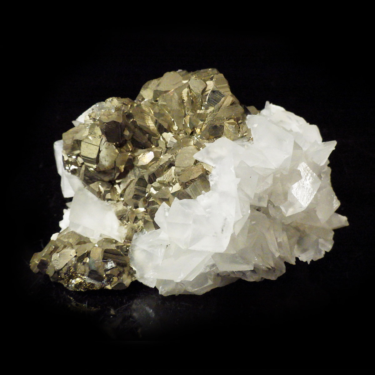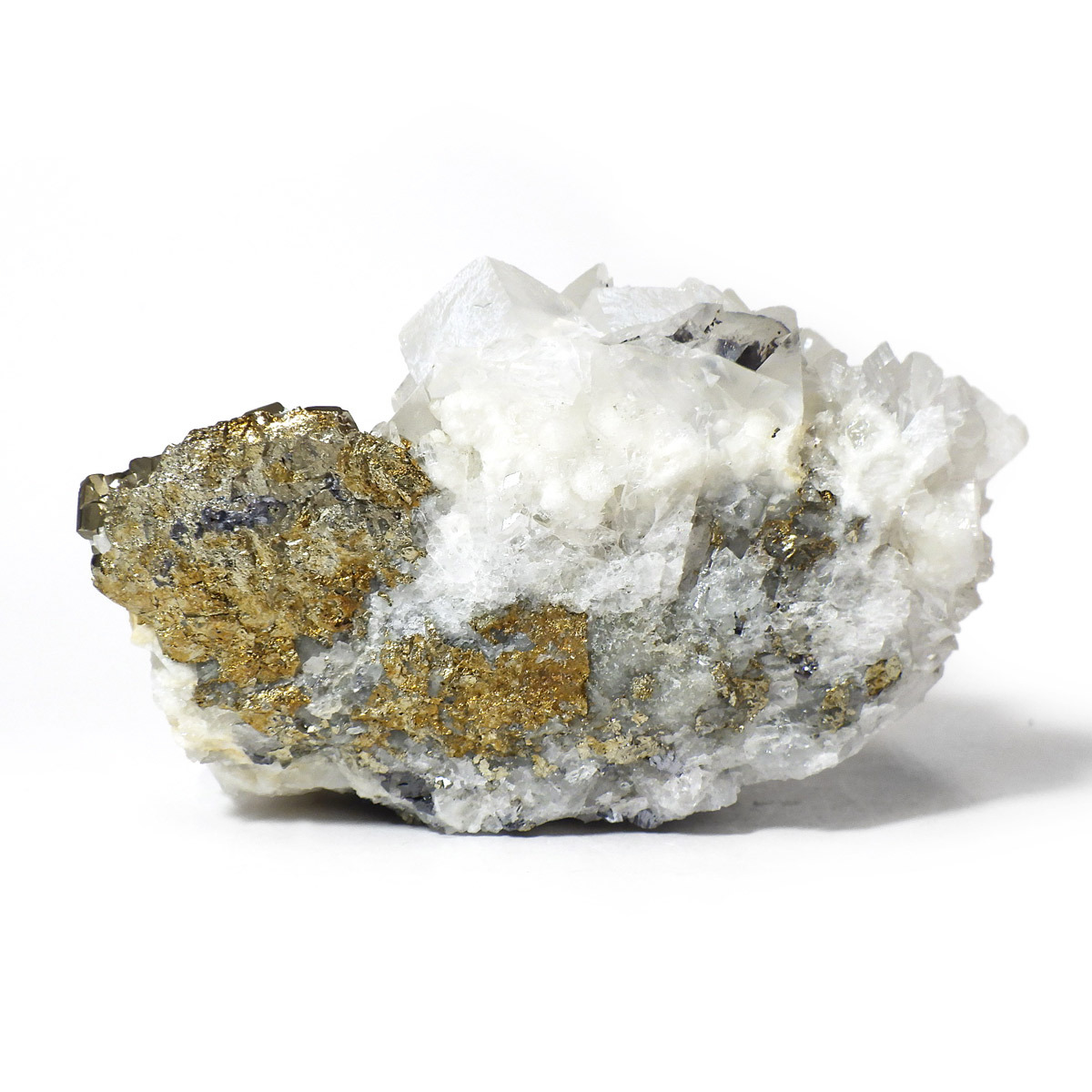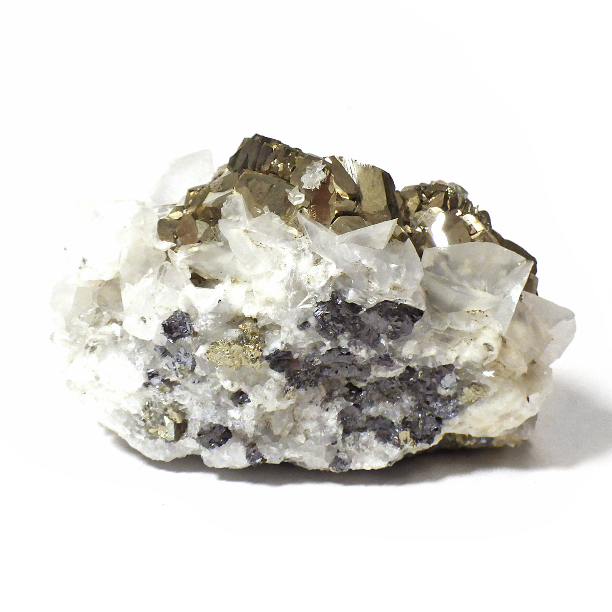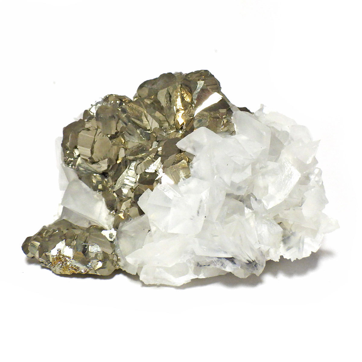 はっきりとした結晶を持つパイライト(黄鉄鉱)とカルサイト(方解石)が共生した原石です。パイライトの金属光沢のある表面が美しく輝き、結晶の形が明瞭で、左右で異なる表情を見せる姿はまさにアートのようです。パイライトの黄金色とカルサイトの柔らかな白色が調和し、重厚感の中にも上品さを感じさせる標本です。| 出价者 | 信用 | 价格 | 时间 |