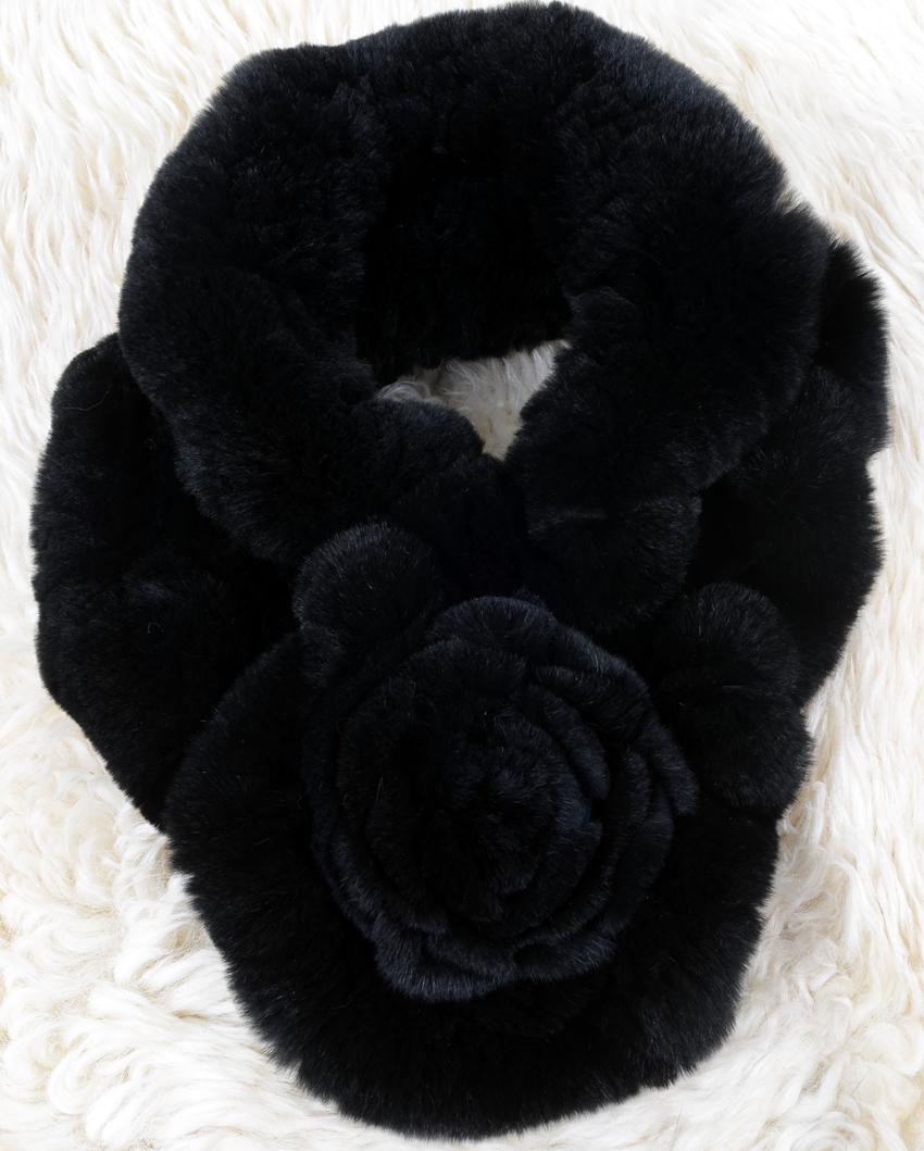| 新品◆お花デザイン★上品なレッキスの編込み マフラー黒/毛皮 リアルファー | ||