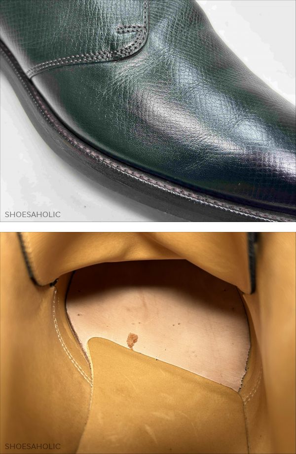 | 商品説明 | ●ご試着について:最下段の<特定商取引法>に記載のある東京都国立市の実店舗にてご試着可能です。 ●出品ID:732 ●管理コード:5460 ●ブランド:エドワードグリーン ●商品詳細:チャッカブーツ #202 ●サイズ・ワイズ :10E ●右足のソールの実寸: 全長: 31.8cm  最大幅: 11.2cm ●カラー:ダークグリーン ●素材:ユタカーフ ●付属品 (  )箱 (  )シューツリー (  )その他(    ) *上記のシューツリーに( 〇 )の記載の無い商品は撮影用のツリーのため付属しません。 *箱はヨレ、キレ、スレ、シミ等がある物もありますので、おまけとお考え下さい。 ●全体的な状態:B ( A:試着程度  B:使用数回  C:極上  D:美品  E:中古  F:一部訳あり) ●アッパーの状態 (  )  試着程度品ですが試着シワ・保管スレキズがあります。  ( 〇 ) スレ、キズ、履きシワがあります。 ( 〇 ) 色ムラ、シミがあります。 ●ライニングの状態 (  ) 試着程度品ですが保管スレキズ・保管シミがあります。  ( 〇 )靴の内側に履きシミがあります。 ( 〇 )靴の内側にスレがあります。 ●ソールの状態 (  )試着程度品ですが試着スレキズ・保管シミがあります。  (  )ハーフラバーが貼ってあります。 (  )トゥはスティール・ラバー・レザーが付いています。 (  )ソールは交換されています。 (  )ヒールは交換されています。 ●特記事項 ・右側面にシワがあります。 ・中底にシミがあります。 ーーーーーーーーーーーー<お知らせ>ーーーーーーーーーーーーー ●お問い合わせについて:質問フォーム またはお電話でお願い致します。 ●実店舗について:店名:シューホリック 所在地:東京都国立市東2-6-6 フジノビル2階 ●営業日について:公式サイト上トップページの「インフォメーション」にてご確認下さい。 ●発送について:定休日・臨時休業日・土日祝日・休暇中 以外の営業日に行います。 ●送料について:ヤマト宅急便 元払い(日時間指定・営業所止め可)の全国一律1000円(北海道、沖縄は+500円) ●入札について:落札後24時間以内に必ず連絡の取れる方、落札後3日以内に決済可能な方のみご入札下さい。 ●お値引きについて:承っておりません。 ●返品について:商品の不備や記載ミス以外、気に入らなかった、サイズが合わなかったなどお客様都合での返品は受け付けていません。 ●評価について:評価は基本的に当ストアよりは差し上げておりません、ご希望の場合お知らせ下さい。 ●同時販売について:実店舗や公式サイトでも併売をしているため、以外で完売後に上で掲載の取り下げが間に合わない場合があり、ご落札後のキャンセルをさせて頂く場合があります。 ●特定商取引法に関する表記● ・販売業者 株式会社 シューホリック ・事業内容 高級靴・高級鞄を専門に販売、輸入および買取業務。 ・運営統括責任者 井上 祐太 ・古物営業許可証 株式会社 シューホリック 東京公安委員会 308891606450 ・郵便番号 〒186-0002 ・住所 東京都国立市東2-6-6 フジノビル2階 ・電話番号:042-508-3596  会社携帯電話:070-4100-5694 ・お支払い方法 かんたん決済 ・お支払い期日 ご落札後 3日以内 .25 |