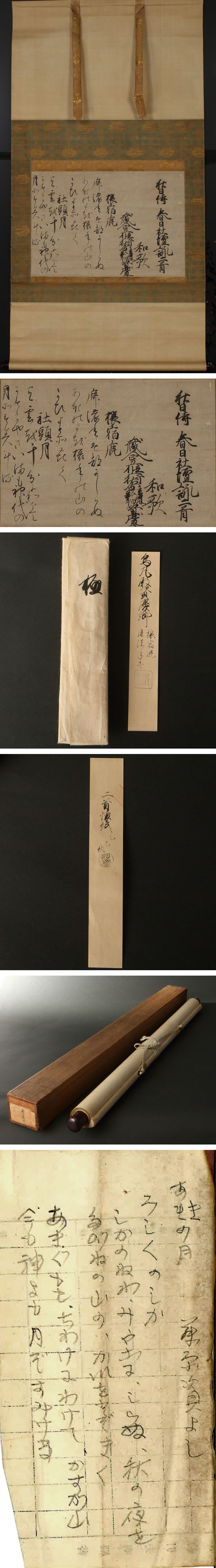 烏丸資慶の和歌詠草です。 「旅宿鹿・社頭月」の二題に、それぞれ「鹿の音は都にしらぬ秋の夜を 旅ねの山のかひよとぞきく」「天雲を千分にわけて春日山 いまも神代の月ぞすみける」と詠んでおります。 資慶の位署から、寛永19(1642)年秋の詠、資慶21歳の書と見られます。折しも不作による飢饉に寛永通宝の過剰鋳造によるインフレが重なり米価が騰貴しており、京都でも火災や地震が頻発する多難の年であったことが知られます。加えて、御所では明正天皇の譲位が進められており、恐らく神前への報告のため資慶が春日社へ派遣されたことが推察されます。 しかし資慶の筆は若々しく伸びやかである一方、詠みぶりは万葉古歌の影響がみられるなど、南都の地を満喫している様子が優に伝わります。公卿に列したのちも春日祭の上卿に二度選ばれることとなる青年公家の、貴重な書の逸品です。 大倉好斎の極札が付属します。 ◆烏丸資慶 江戸前期の公卿,歌人。参議をへて万治元(1658)年権大納言となり,寛文2(1662)年正二位にすすむ。祖父の光広に歌学をまなび,後水尾院の歌会に参加。同4(1664)年後西院らとともに後水尾院から古今伝授をうけた。寛文9(1669)年没、48歳。著作に「烏丸資慶詠草」など。 ◆大倉好斎 江戸後期の古筆見、京都の人。紀州徳川家に仕え、法橋に叙せられる。文久2(1863)年没。 付属:時代箱が付属します。 寸法:縦116×横61cm(最大幅。若干の誤差はご了承下さい) 状態:経年のイタミがございます。 |