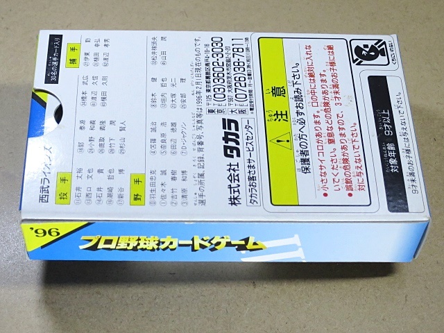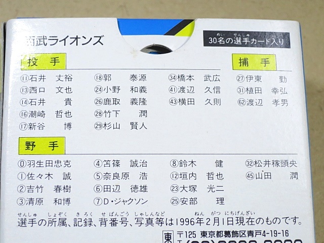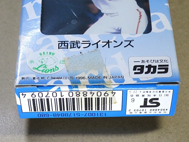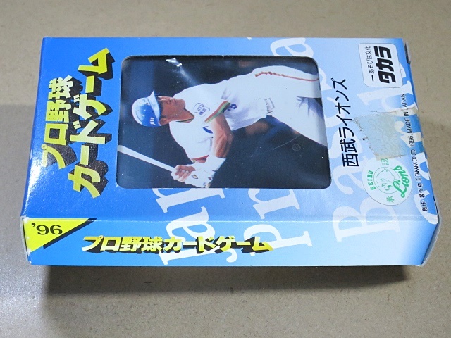 タカラ プロ野球カードゲーム_1996年_西武ライオンズ ・選手30名のカード30枚 ・サイコロ2個 ・ゲーム使用時シート ・未使用 ・製造からほぼ30年近く経過しておりますので若干のパッケージのイタミはご理解ください。 ・ 石井丈裕 、西口文也 、石井貴 、潮崎 哲也 ・ 新谷 博 、郭泰源 、小野和義 、鹿取義隆 ・ 竹下潤 、杉山賢人 、橋本武広 、渡辺久信 ・ 横田久則 、伊藤勉 、植田幸弘 、渡辺孝男 ・ 羽生田忠克 、佐々木誠 、吉竹春樹 、清原和博 ・ 笘篠誠治 、奈良原浩 、田辺徳雄 、D・ジャクソン ・ 鈴木健 、垣内哲也 、大塚光二 、安部理 ・ 松井稼頭央 、山田潤 |