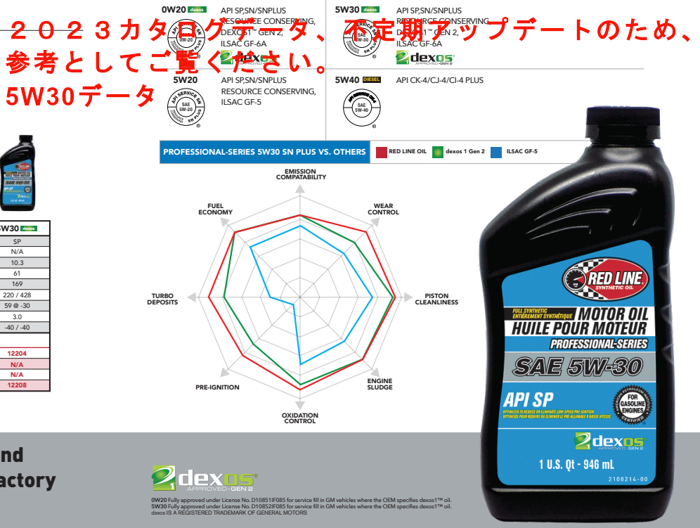 レッドラインオイルは世界中で、多くのトップレーシングチームに使用されています。 日本でも、ジムカーナー、サーキット、D1から、一般走行まで様々なシーンで使用されております。 レースで使われるオイルではなく、レースで勝つために作られたオイルです。 世界トップクラスの性能を持つレッドラインをお楽しみ下さい。 100%本物!安心の日本正規輸入品です! 1本=1QT (946ml) Red Line Professional Series(プロフェッショナルシリーズ) お客様のご要望にお応えして、OEM 規格 Red Line 製品が誕生しました。(非エステル系) プレミアム品質の全合成エンジンオイルで独自の高性能添加剤パッケージで処方されています。 日常使いから厳しい条件下までエンジンを確実に保護し、エンジン内部をキレイな状態に保ちます。 ターボチャージャー付きガソリン直噴エンジン、ライトトラック、通常車、ハイブリッド車などに。 【特長】 ・LSPI(低速早期着火)を抑制 ・高温に強く、粘度が落ちにくい ・低温時でも素早く循環 ・蒸発しにくく、オイル減りが少ない 【規格】(不定期でアップデートされる場合がございます。ご了承下さい。) ・ILSAC GF-6 ・API SP Resource Conserving(通常SPのワンランク上) ・GM dexos1 Gen2 |