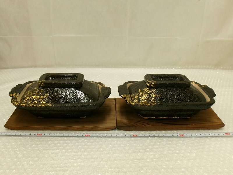 P6491 黒釉 金箔 土鍋 2点 蓋付 長方皿 1人用 木製台付 |