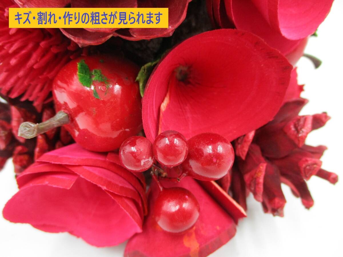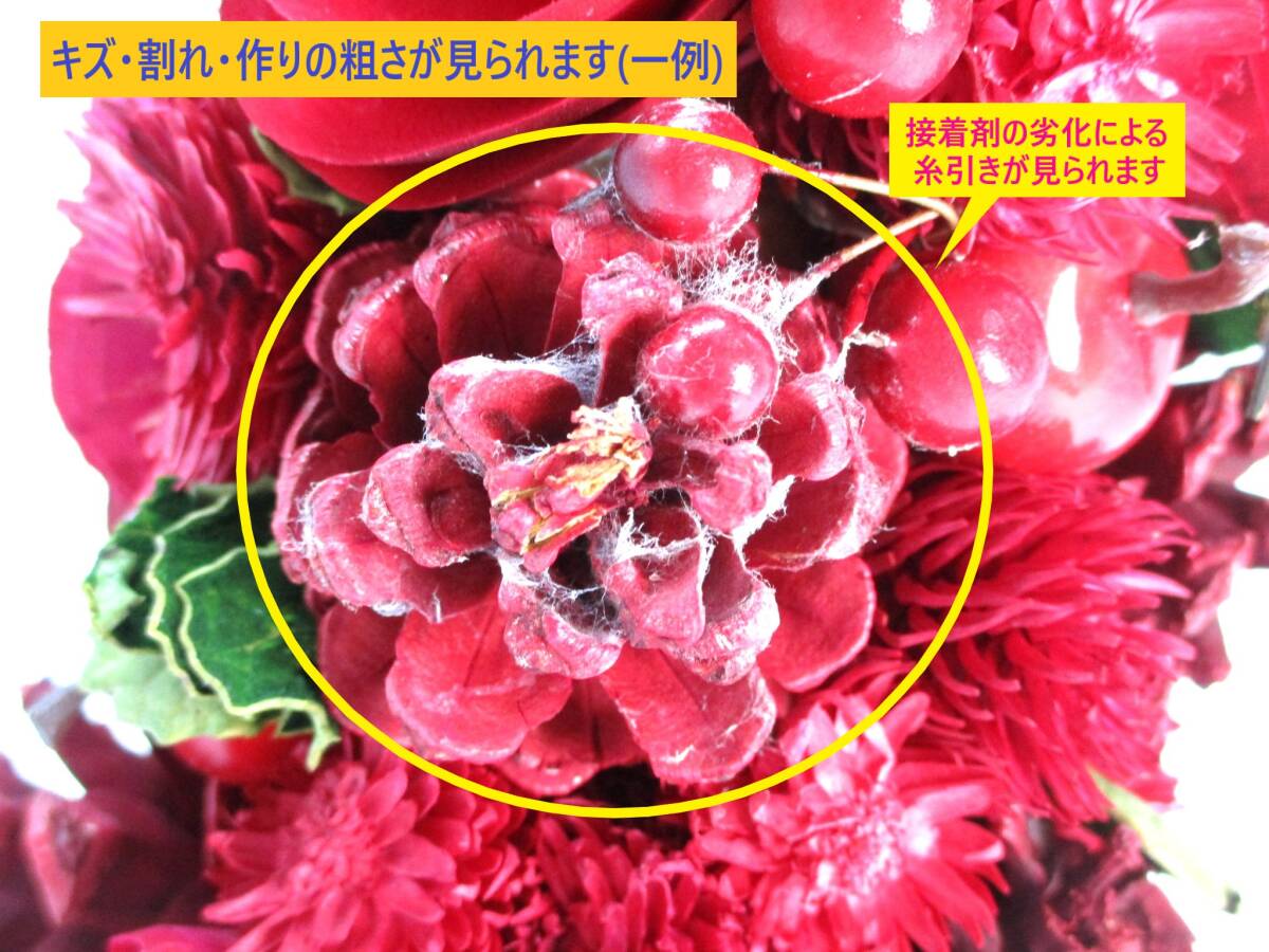 | 「訳あり」扱いの、未使用品。 倉庫での長期保存品です。 コンパクトなサイズながら 落ち着いた色合いで人目をひくツリーです。 赤リンゴや松ぼっくり、 ベリーやお花があしらわれています。 主にドライした自然素材が使用されています。 このまま飾っていただくのはもちろん、 ご自身でお好みにデコレーションして、 オリジナルのクリスマスツリーを 作っていただくのも楽しいと思います。 (参考:画像9) 自然素材のため、長期のご使用に伴い、 色あせ・材質変化等が生じる場合があります。 また、配送時の振動などにより、 造形の多少の崩れ・部品外れ・ 装飾に欠け等が生じる場合がありますが、 この点に関しましては 当方はサポートをいたしません。 あらかじめご了承下さい。 今回のお品は 部分的に 接着剤の劣化が原因と思われる 「糸引き」が目立ちます。 (参考:画像5・他) この点より「訳あり」として出品いたします。 以下の商品説明をよくご覧になってから、 ご検討をお願いいたします。 神経質な方、完品をご希望の方は、 御入札をご遠慮ください。 【商品内容】 小さな 可愛い 赤リンゴの クリスマス ツリー ・サイズ: 径15cm・高さ23cm程度 (装飾の付き方により多少の差異あり) *サイズ対比に、 600mlペットボトルを置いています 参考にどうぞ(参考:画像8) ・重量: 200g程度 ・ツリーの主な素材: 木の実・樹皮・ドライフラワー *土台は 発泡スチロール等 *ドライした自然素材を主に使用し すべて1つずつ手作りしています ・その他: 海外製/メーカー等の詳細は不明 ライト等の装飾は付いておりません 装飾品の付き方によりましては 台座が浮いた状態になっている 場合があります(参考:画像10・上) ・備考: 商品配送時の振動・衝撃等で 部品外れ等の破損が生じた場合は 木工用ボンドや手芸用グルーガンで 簡単に修繕可能です *状態は、画像にてご確認ください *実際の商品の色味と異なる場合があります *記載の商品サイズは、 当方の定規にての大まかな寸法です 実際のサイズとは異なる場合があります *画像は 基本的には 今回お送りするお品を撮影していますが 画像9のみ撮影用を使用しています 【状態等】 ・未使用品です。 ・海外製のため、 装飾品の固定・接着剤の付着など、 全体的に作りに粗さがある場合があります。 (参考:画像5・6・7、他) ・装飾品に、キズ・欠け・凹み等がある 場合があります。 ・自然素材のため、長期のご使用に伴い、 色あせ・材質変化等が生じる場合があります。 また、配送時の振動などにより、 造形の多少の崩れ・部品外れ・ 装飾に欠け等が生じる場合がありますが、 この点に関しましては 当方はサポートをいたしません。 ・保管時に使用していた 防虫・殺虫剤の臭いがする場合があります。 苦手な方、気になさる方は、 風通しの良いところで 臭いを飛ばしていただくことをお勧めします。 ・専用の箱などは、ありません。 紙・緩衝材で簡易的に保護し、 再利用箱に入れて発送をいたします。 (参考:発送状態・画像10・下) 以上の点より「訳あり」として出品いたします。 ご承知いただける方のみ、 ノークレーム・ノーリターンにてご検討下さい。 | ||