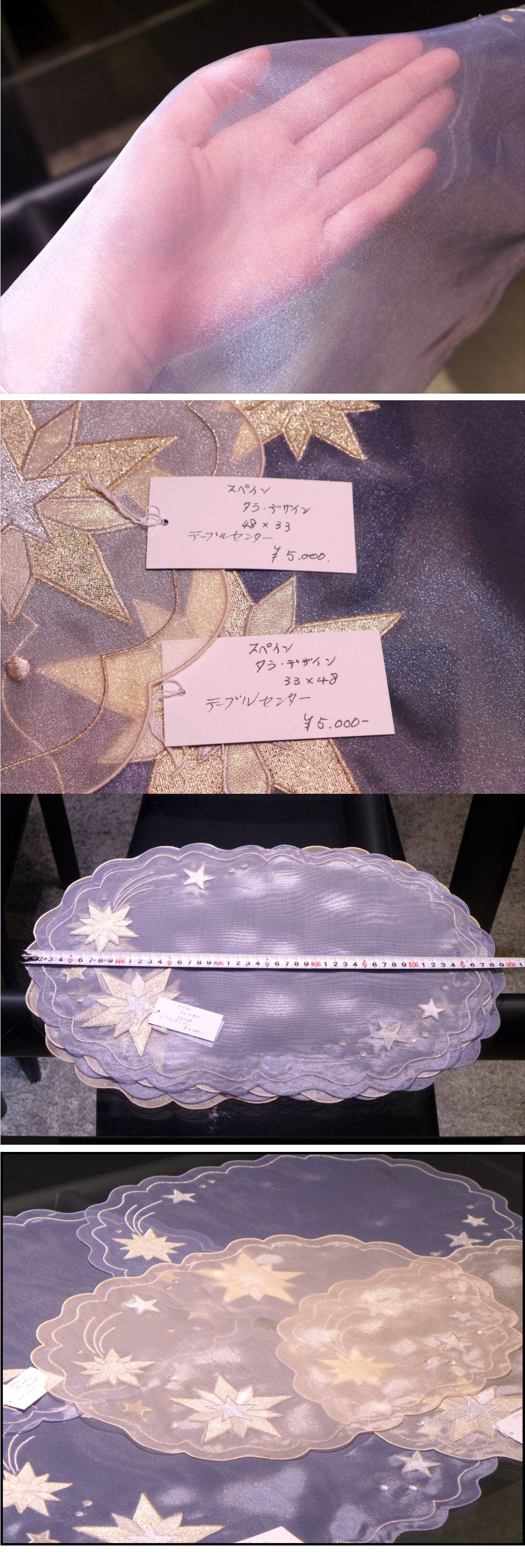 g未使用 スペイン製 Tara タラ スター 星柄 シアー素材 テーブルセンター 2色6点まとめて。主観ですがかなり透け感があるタイプです。大きさは画像参照でお願いいたします。未使用ですが、経年保存品の為、画像をよく見て頂き、状態に了承いただいた方のみの御入札をお願い致します。 【注意:折りたたんでの発送になります】★当オークションにて他にも敷物類を出品しております。是非ご覧下さい。★